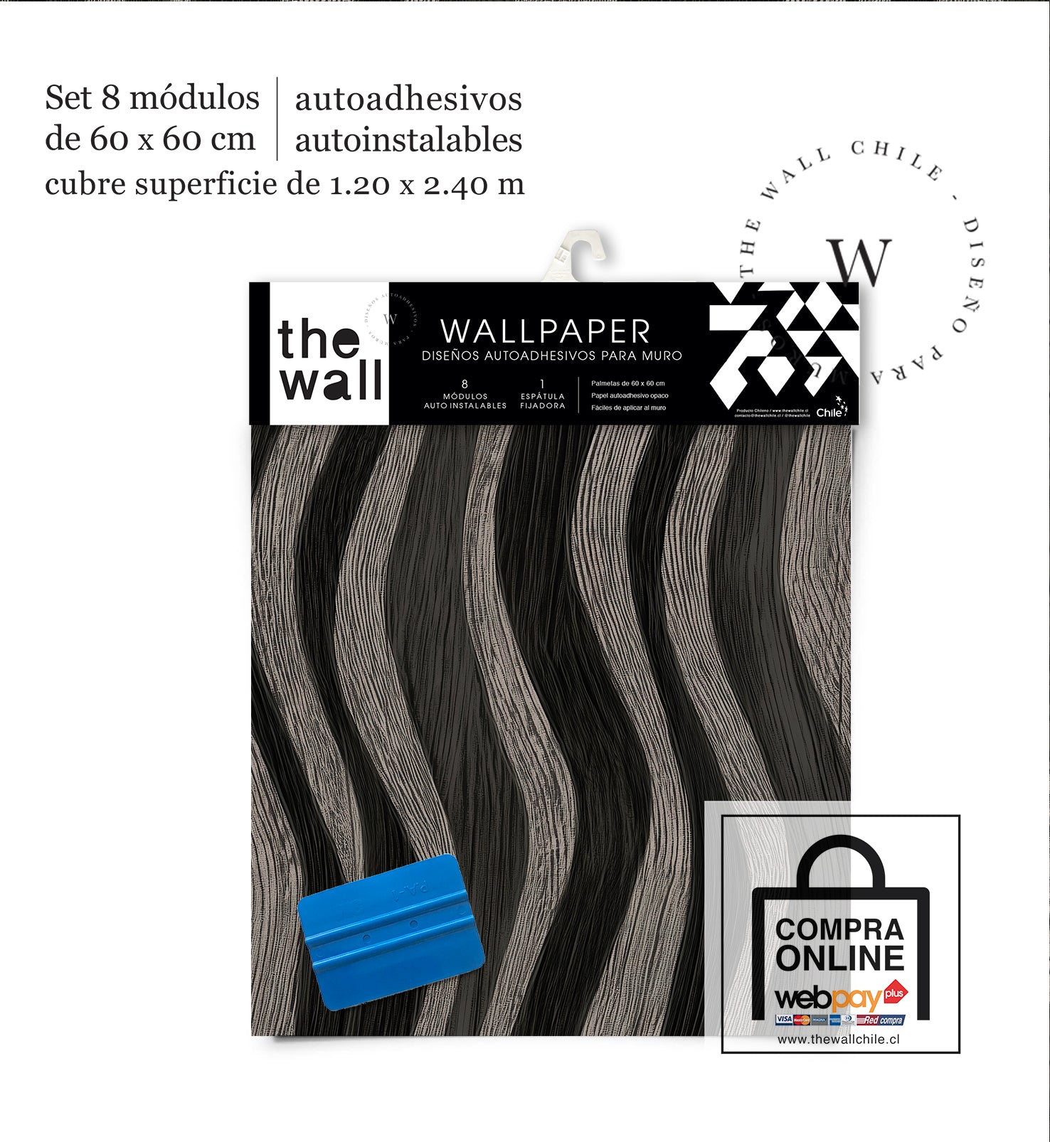 2. Set de Módulos: Módulos adhesivos y auto instalable de 60 x 60 cm que forman un patrón mayor de 1,2 x 2,4 mts (2,44 m2). Con paleta 3M para su perfecta aplicación.