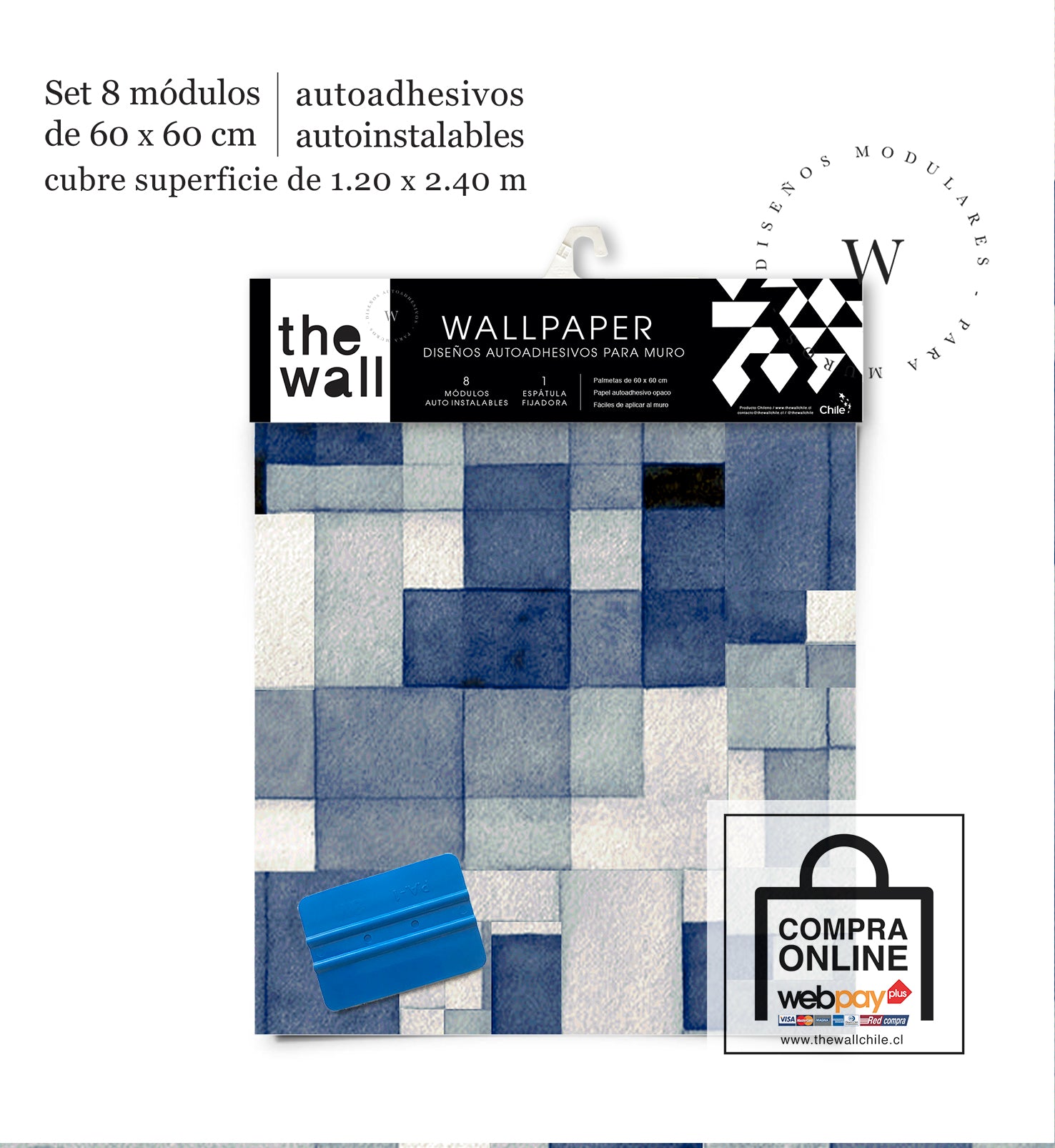 2. Set de Módulos: Módulos adhesivos y auto instalable de 60 x 60 cm que forman un patrón mayor de 1,2 x 2,4 mts (2,44 m2). Con paleta 3M para su perfecta aplicación.