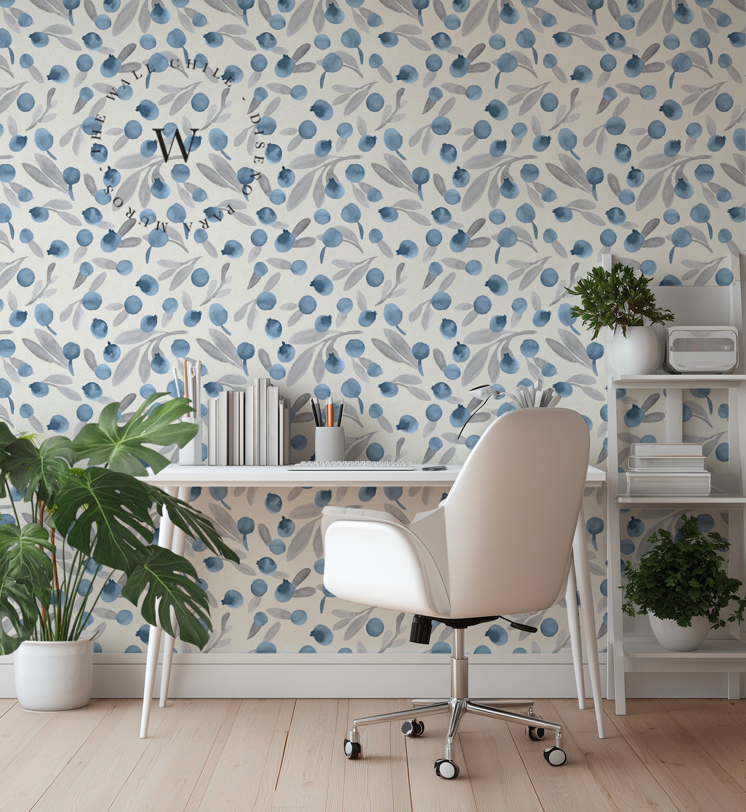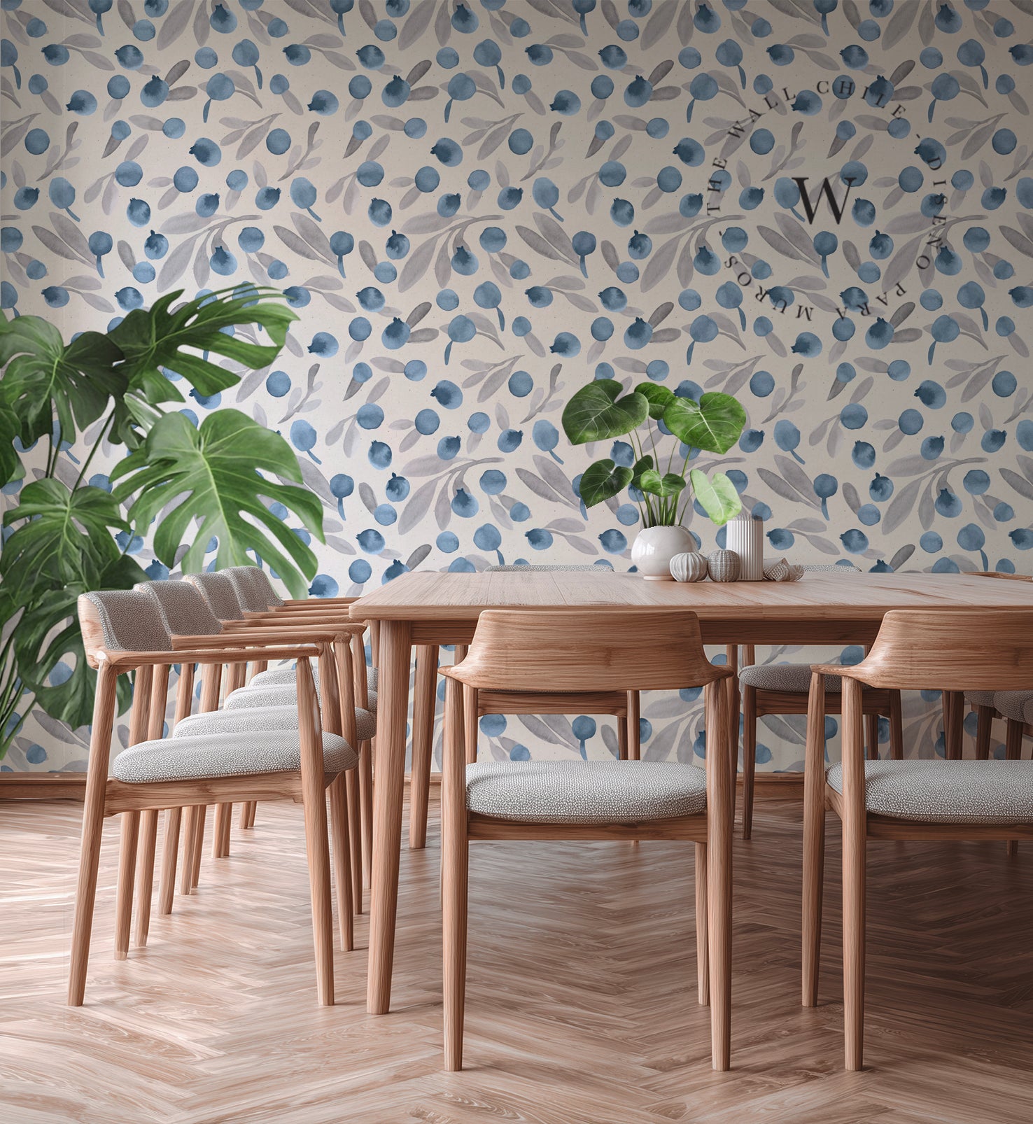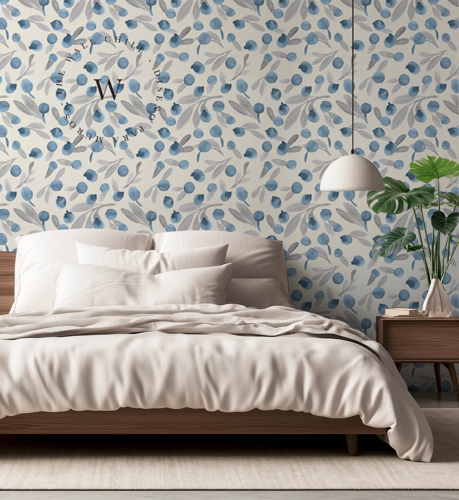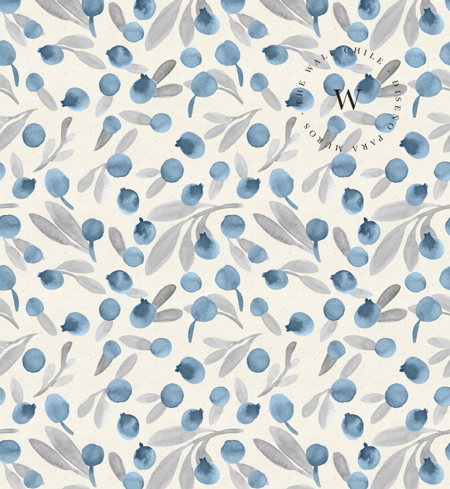 Un diseño delicado y fresco que evoca la simpleza de la naturaleza en su estado más sutil. Blue Berries combina pequeñas bayas en tonos azul profundo con hojas en grises suaves sobre una base neutra, creando un patrón liviano, elegante y atemporal.