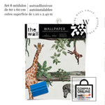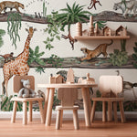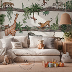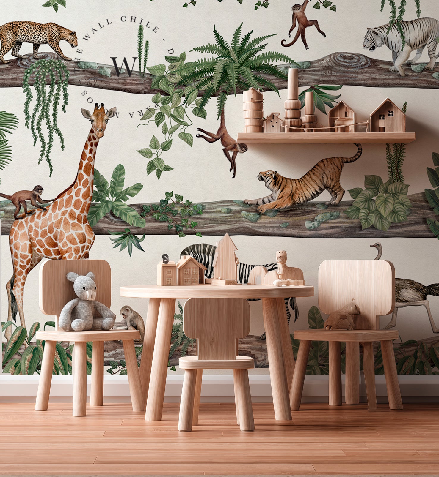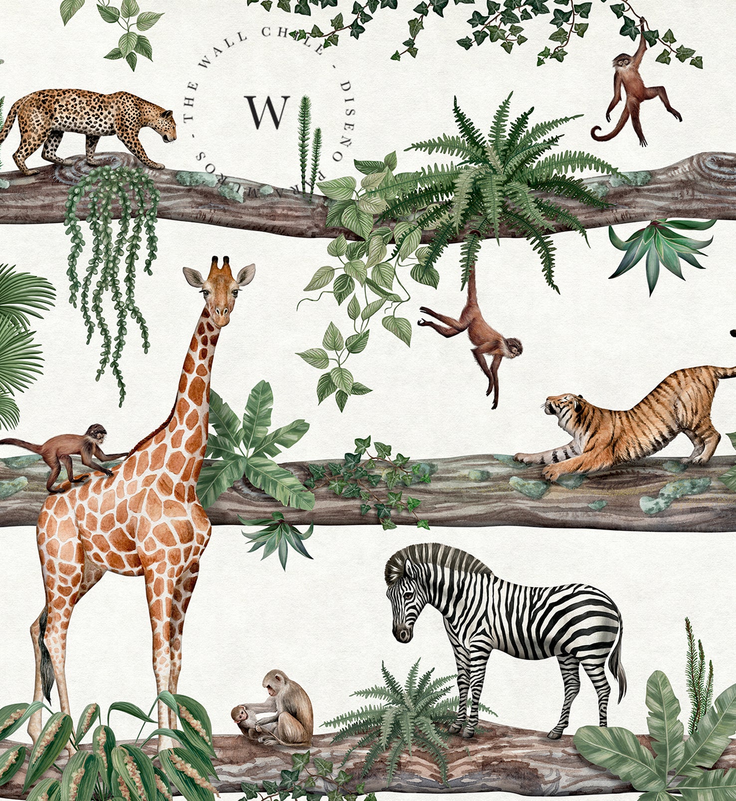 El papel mural Amazing Animals celebra la diversidad y majestuosidad del mundo salvaje a través de una composición ilustrada llena de movimiento y vida. En un entorno de ramas y follajes tropicales, jirafas, tigres, cebras y monos conviven en perfecta armonía, recreando una escena natural vibrante y elegante.