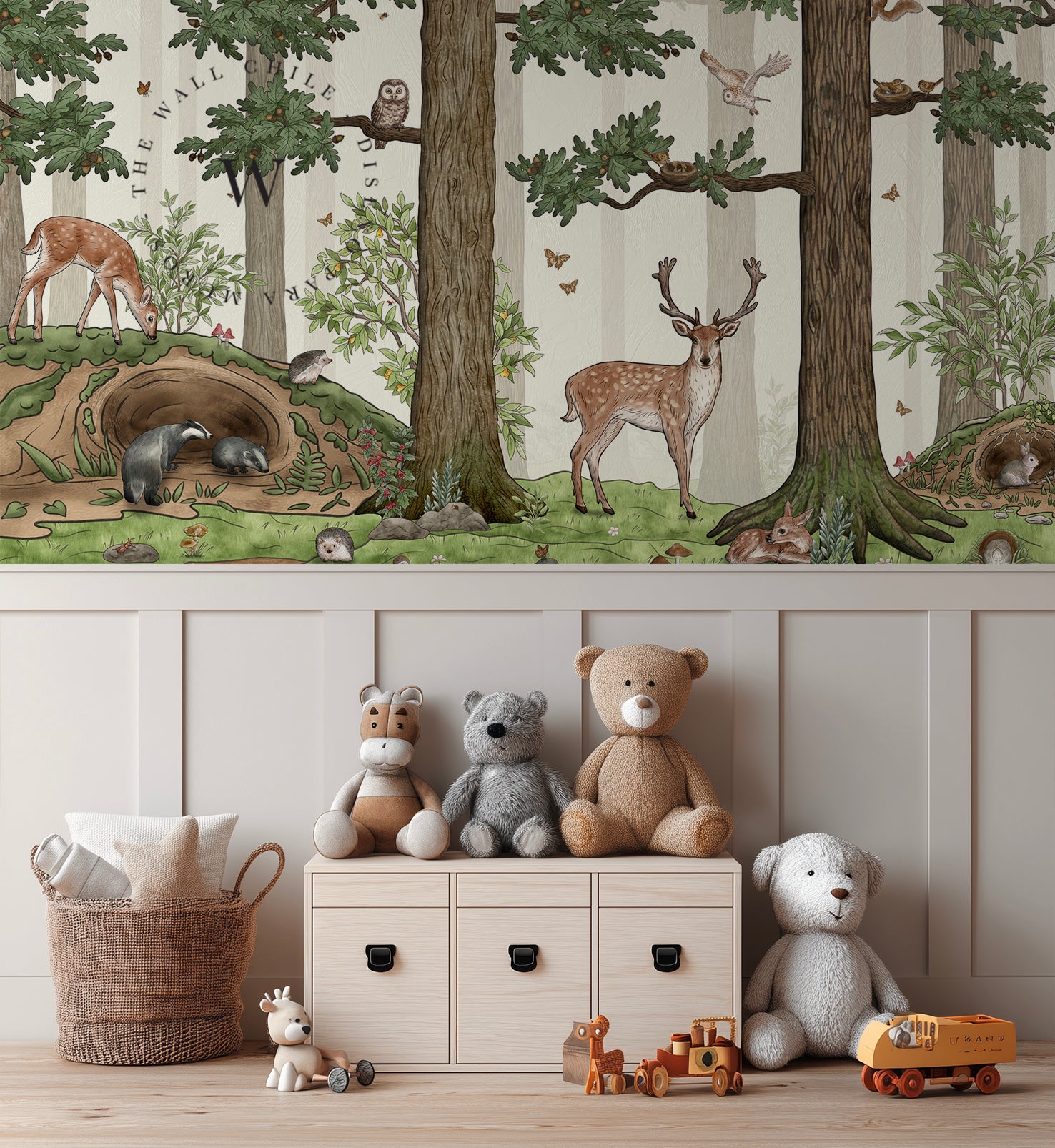 Su paleta de tonos suaves —verdes, marrones y beige cálido— crea una atmósfera acogedora y armoniosa, ideal para habitaciones infantiles, espacios familiares o zonas de lectura. Este diseño invita a la imaginación y al descubrimiento, convirtiéndose en una ventana a un mundo natural lleno de ternura y calma.