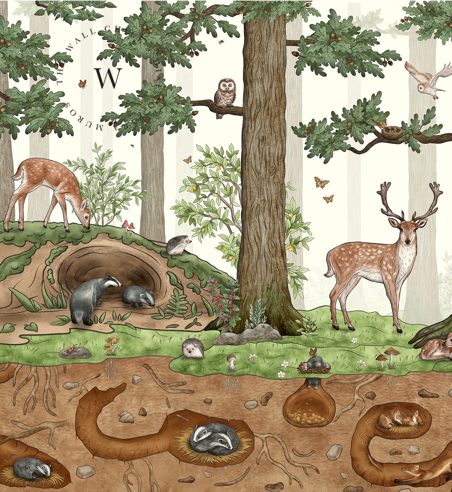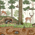 El papel mural Animals in the Forest transforma los muros en una escena de cuento llena de vida y encanto natural. Con un estilo ilustrativo detallado, retrata un bosque donde ciervos, tejones, búhos y erizos conviven entre raíces, troncos y madrigueras, mostrando la magia de la naturaleza tanto sobre la tierra como bajo ella.