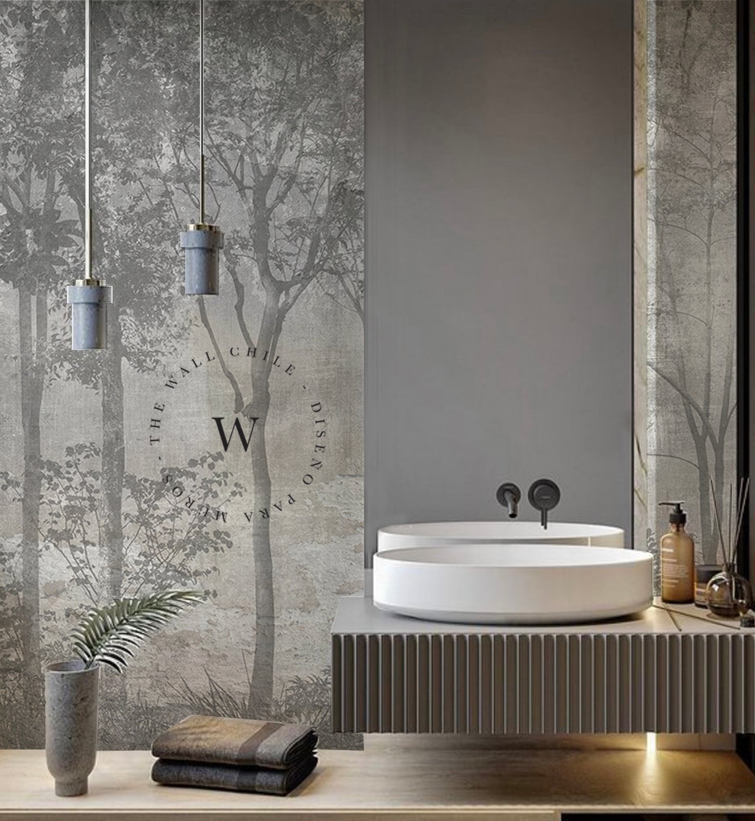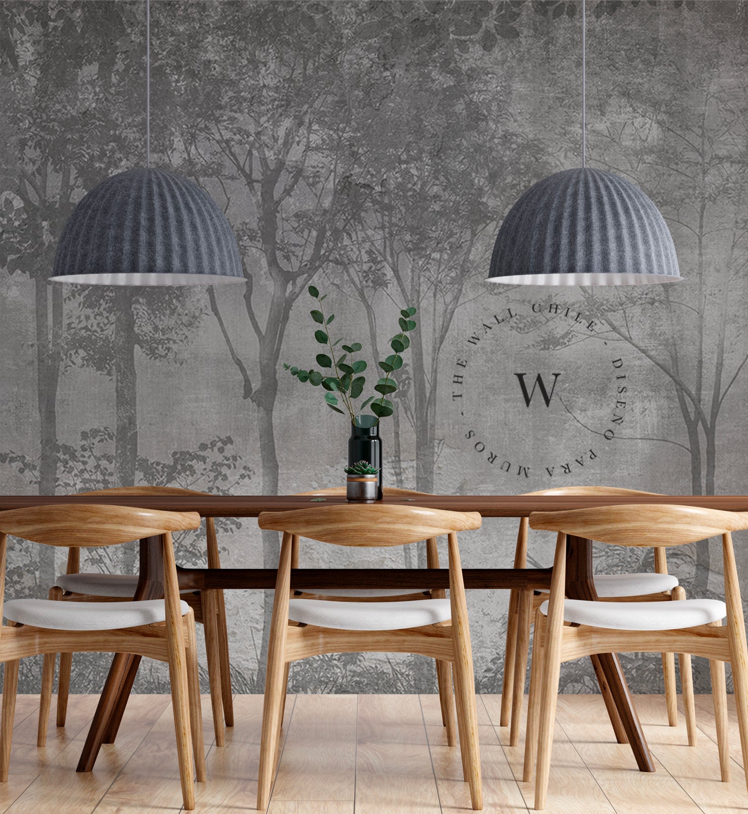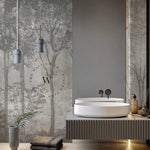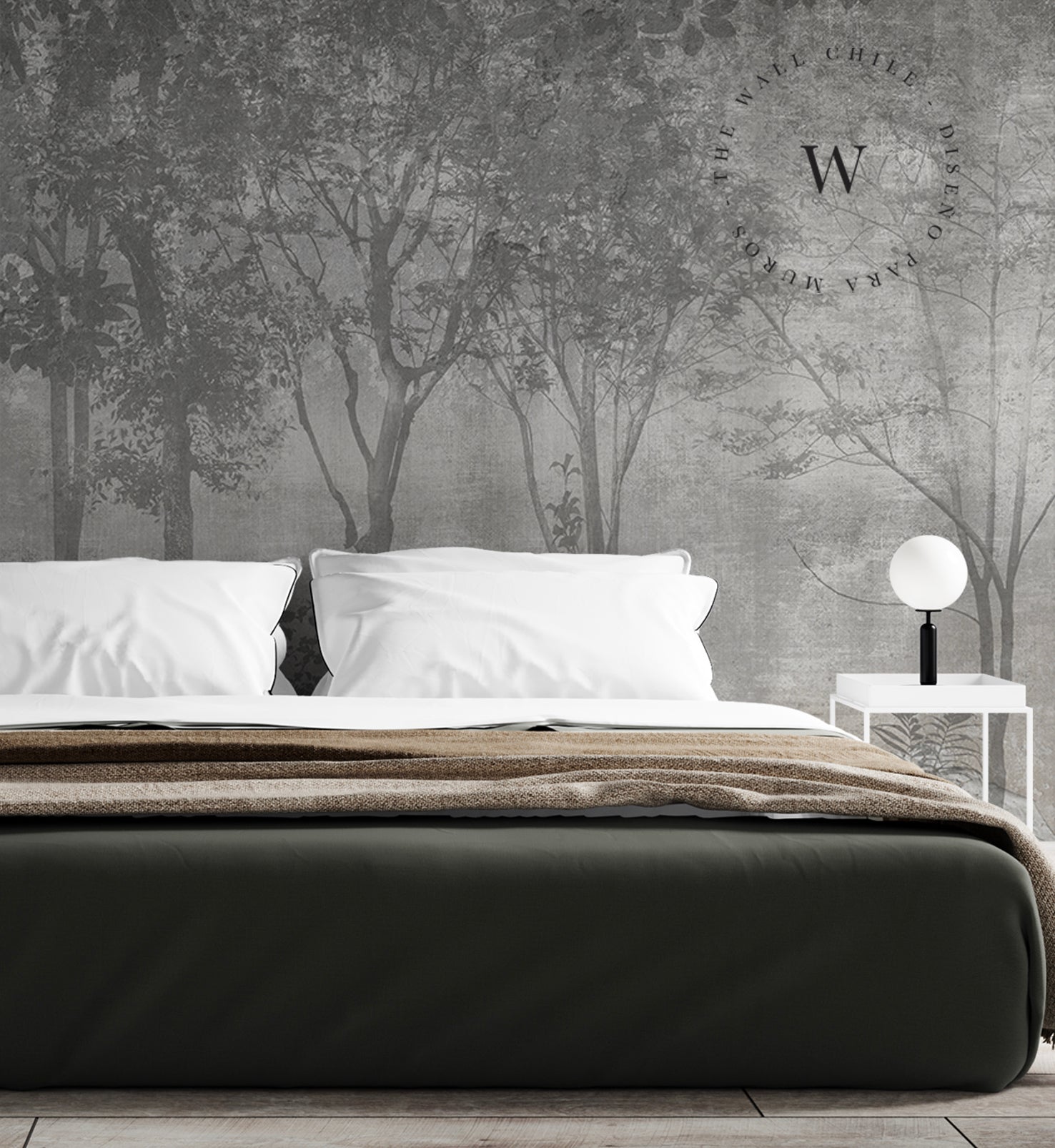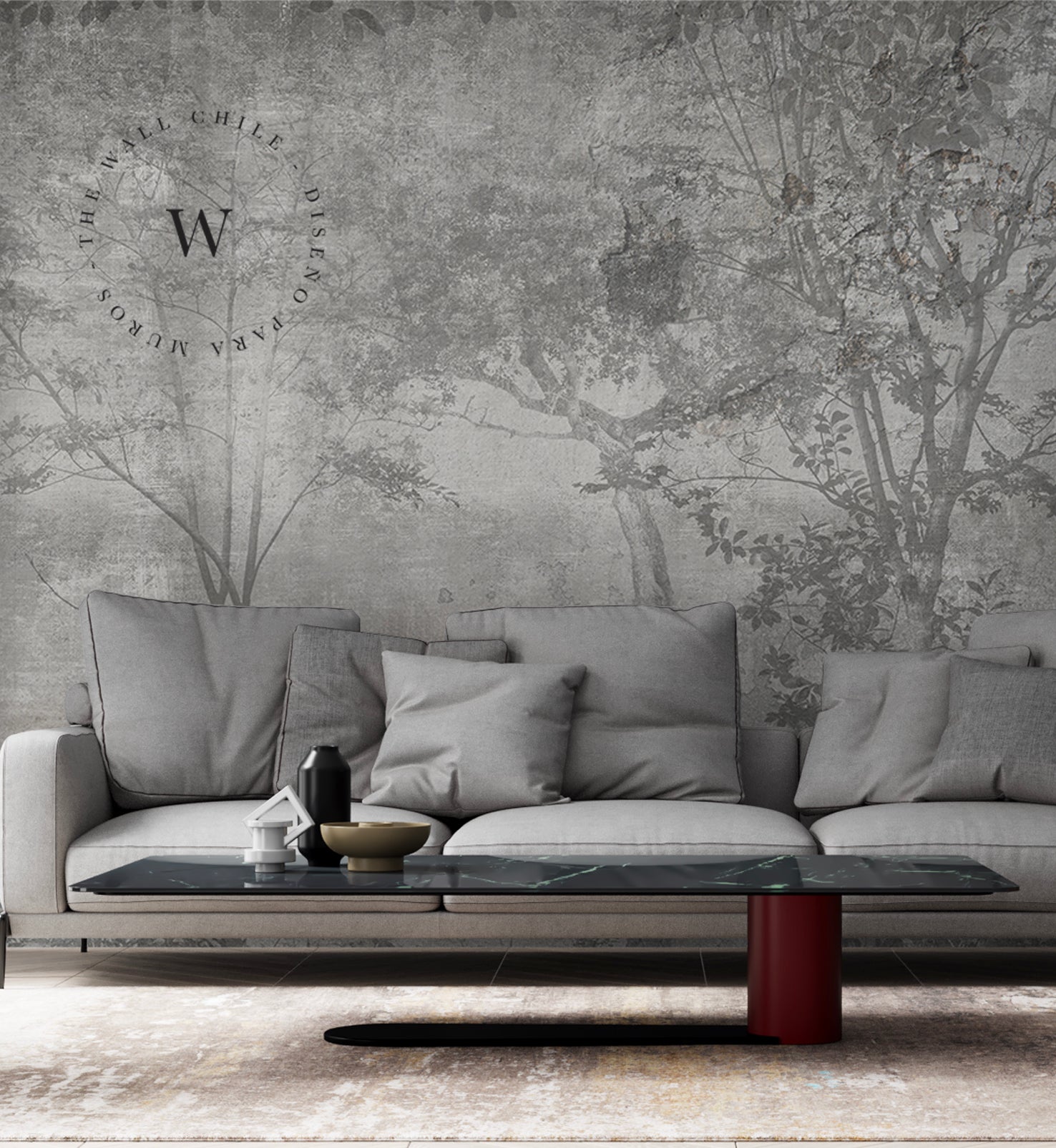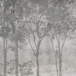 Tapestry es un papel mural de estética poética y sofisticada que representa un bosque envuelto en niebla, con árboles difuminados y textura envejecida que evoca la apariencia de un tapiz antiguo.