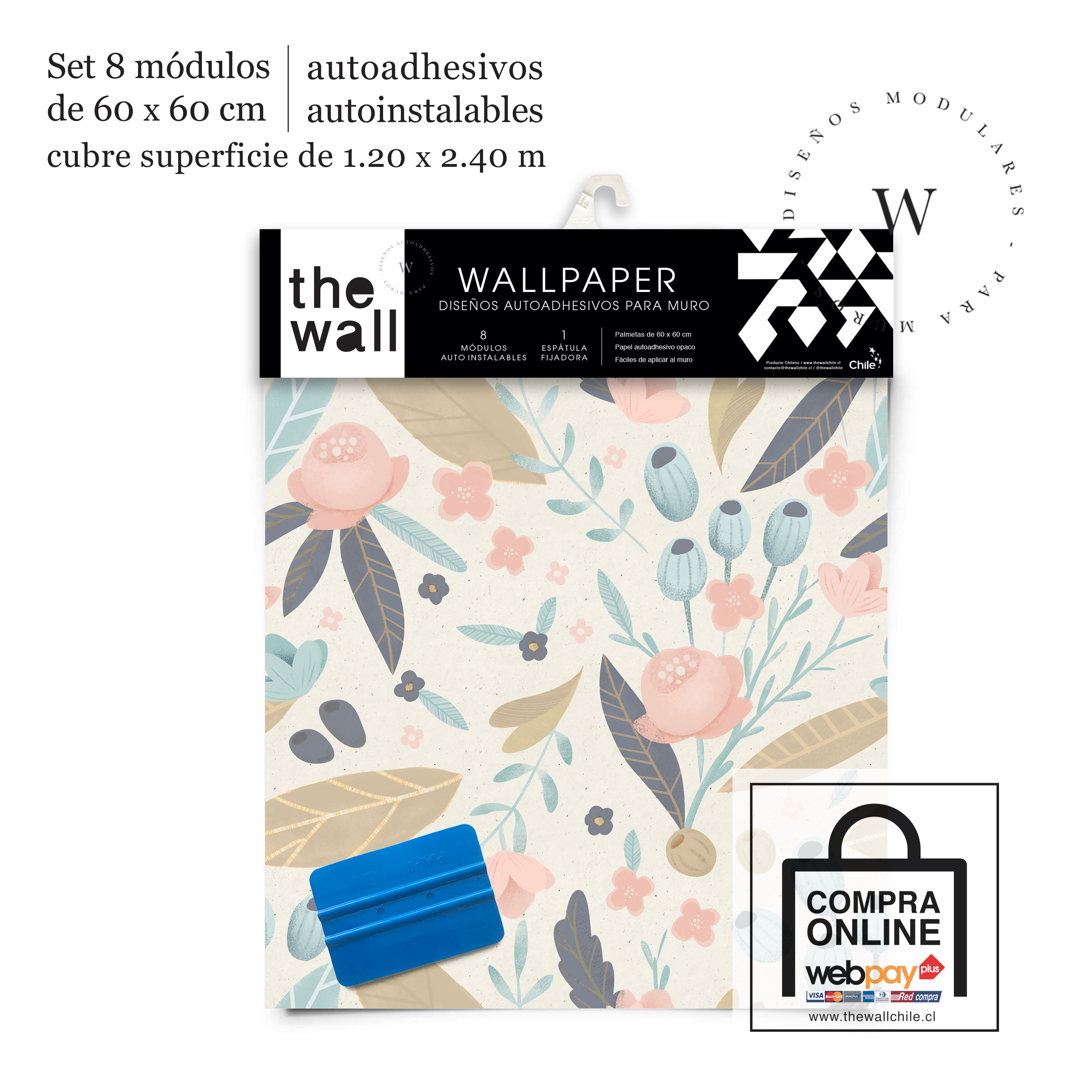 2. Set de Módulos: Módulos adhesivos y auto instalable de 60 x 60 cm que forman un patrón mayor de 1,2 x 2,4 mts (2,44 m2). Con paleta 3M para su perfecta aplicación.