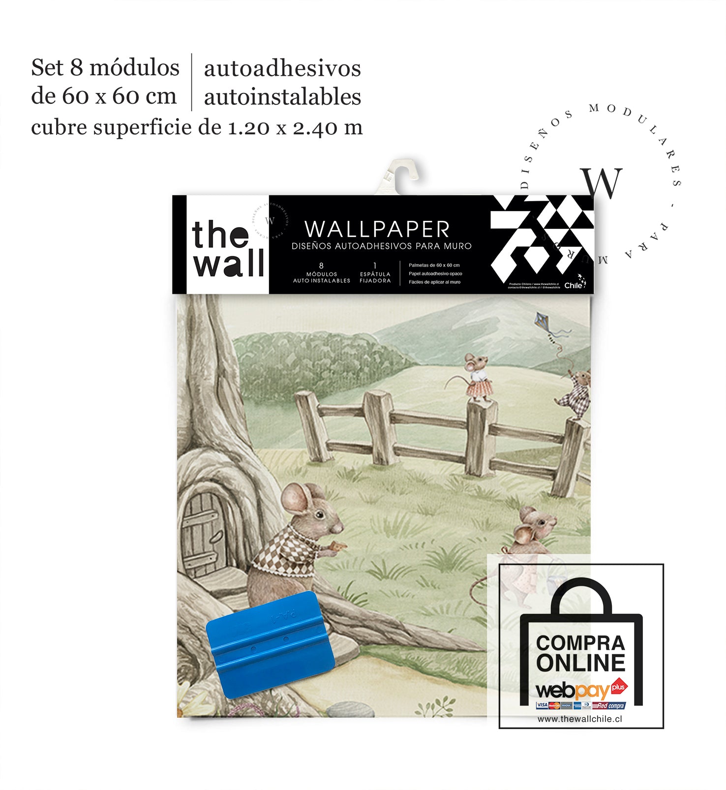 2. Set de Módulos: Módulos adhesivos y auto instalable de 60 x 60 cm que forman un patrón mayor de 1,2 x 2,4 mts (2,44 m2). Con paleta 3M para su perfecta aplicación.