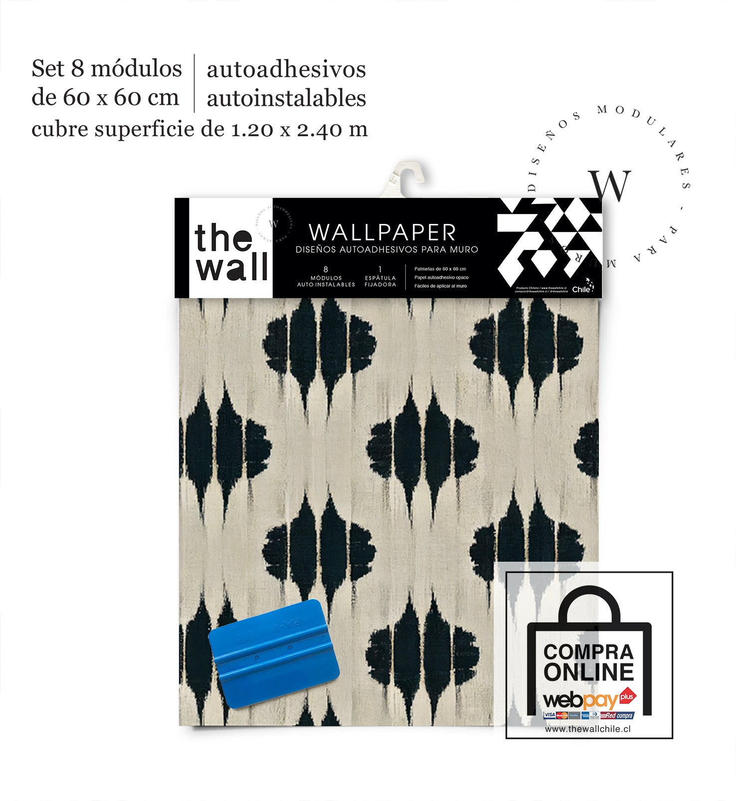 2. Set de Módulos: Módulos adhesivos y auto instalable de 60 x 60 cm que forman un patrón mayor de 1,2 x 2,4 mts (2,44 m2). Con paleta 3M para su perfecta aplicación.