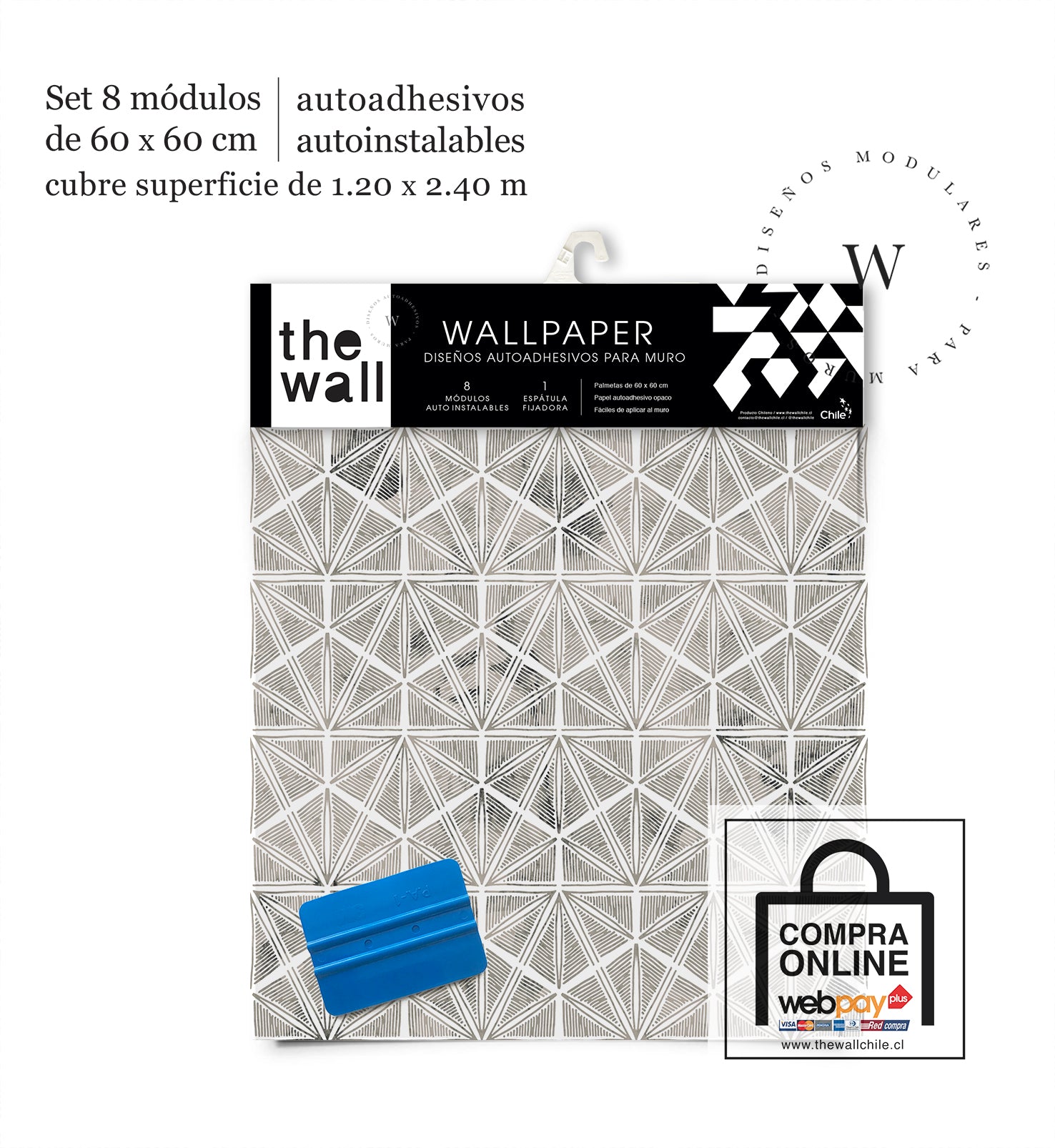 2. Set de Módulos: Módulos adhesivos y auto instalable de 60 x 60 cm que forman un patrón mayor de 1,2 x 2,4 mts (2,44 m2). Con paleta 3M para su perfecta aplicación.