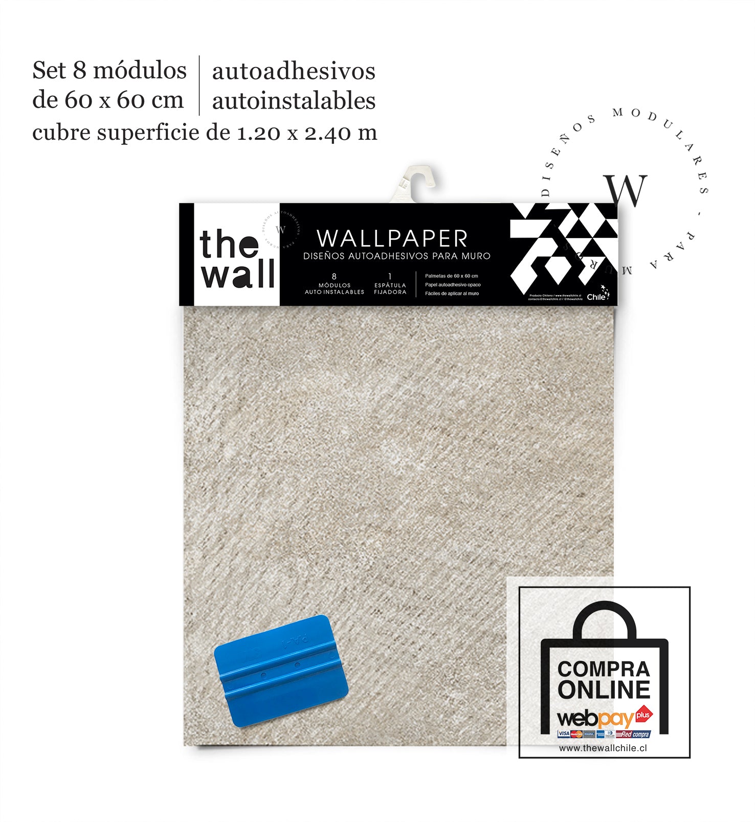 2. Set de Módulos: Módulos adhesivos y auto instalable de 60 x 60 cm que forman un patrón mayor de 1,2 x 2,4 mts (2,44 m2). Con paleta 3M para su perfecta aplicación.