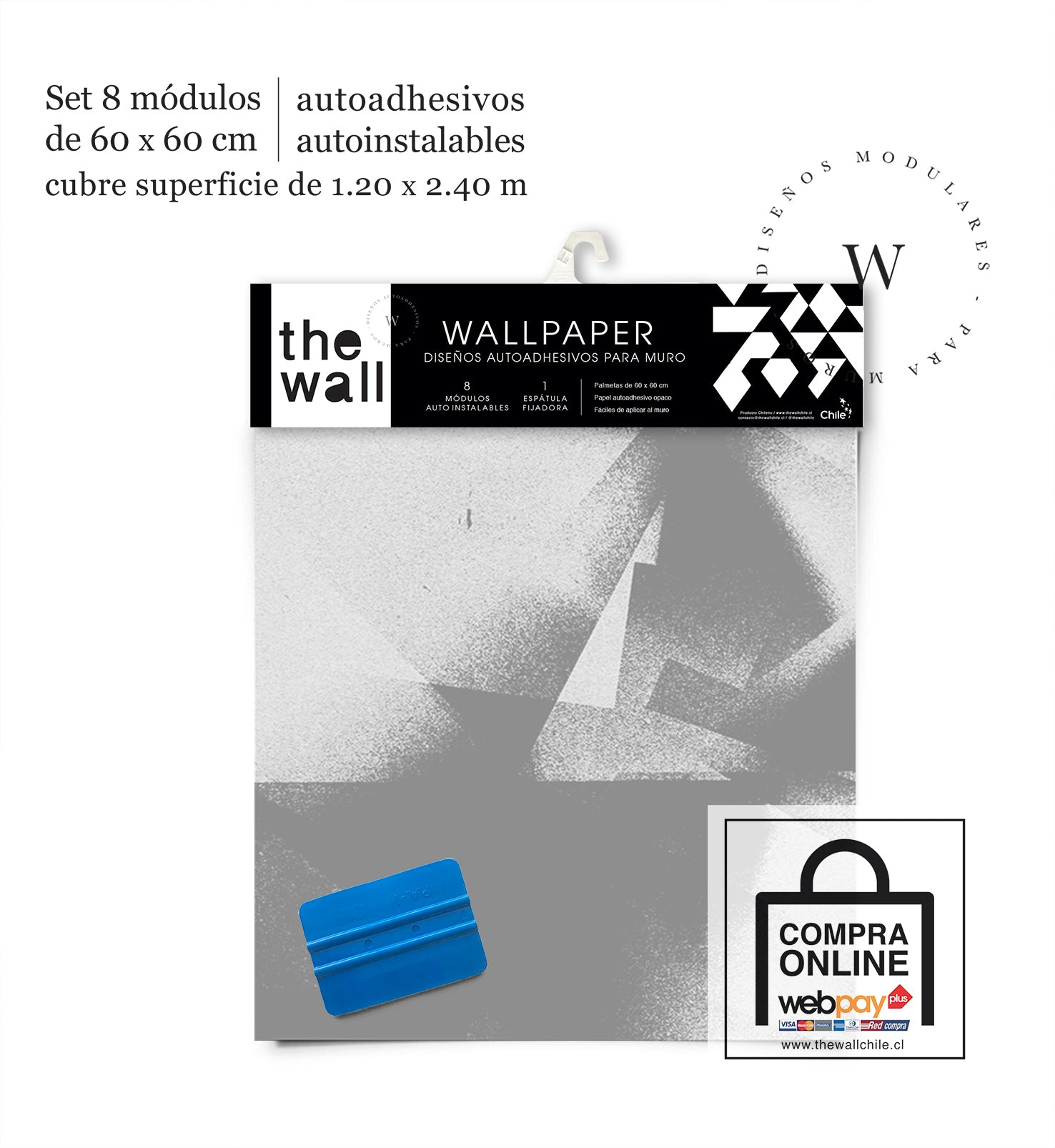 2. Set de Módulos: Módulos adhesivos y auto instalable de 60 x 60 cm que forman un patrón mayor de 1,2 x 2,4 mts (2,44 m2). Con paleta 3M para su perfecta aplicación.