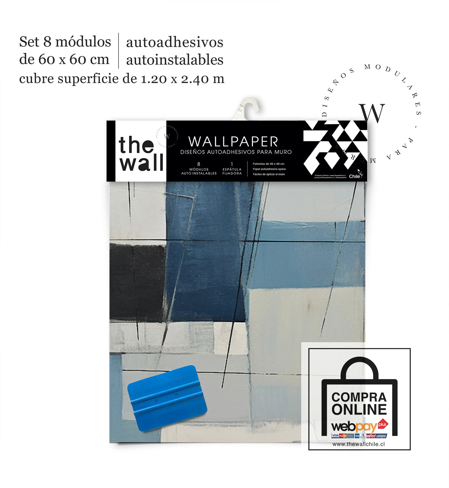 2. Set de Módulos: Módulos adhesivos y auto instalable de 60 x 60 cm que forman un patrón mayor de 1,2 x 2,4 mts (2,44 m2). Con paleta 3M para su perfecta aplicación.