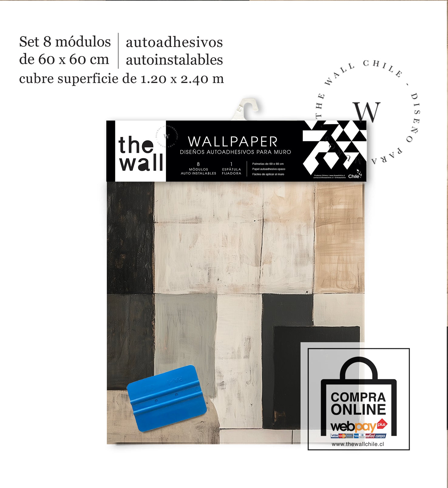 2. Set de Módulos: Módulos adhesivos y auto instalable de 60 x 60 cm que forman un patrón mayor de 1,2 x 2,4 mts (2,44 m2). Con paleta 3M para su perfecta aplicación.