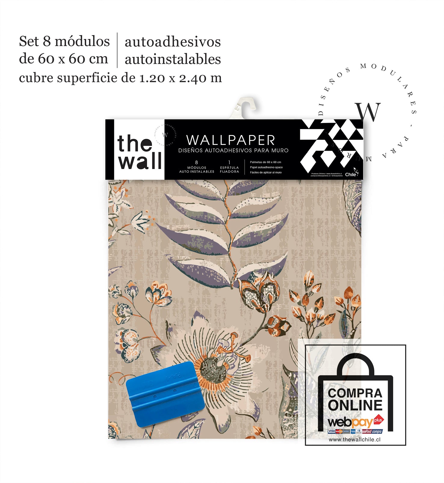 2. Set de Módulos: Módulos adhesivos y auto instalable de 60 x 60 cm que forman un patrón mayor de 1,2 x 2,4 mts (2,44 m2). Con paleta 3M para su perfecta aplicación.
