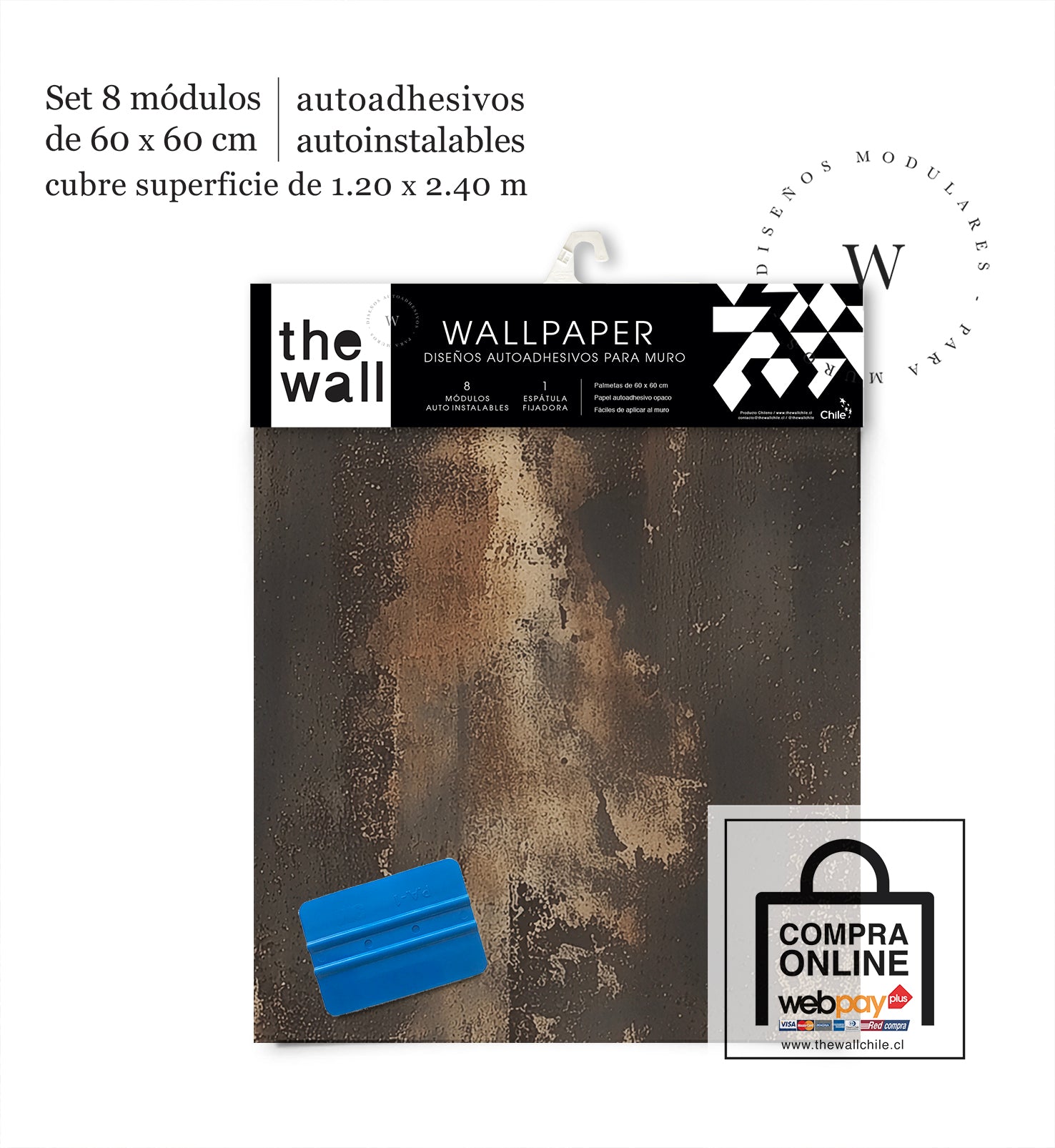 2. Set de Módulos: Módulos adhesivos y auto instalable de 60 x 60 cm que forman un patrón mayor de 1,2 x 2,4 mts (2,44 m2). Con paleta 3M para su perfecta aplicación.