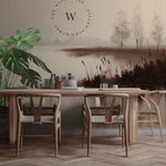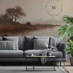Mint Landscape es un papel mural artístico y sereno, que evoca la tranquilidad de un amanecer sobre un lago en calma.