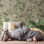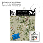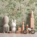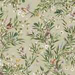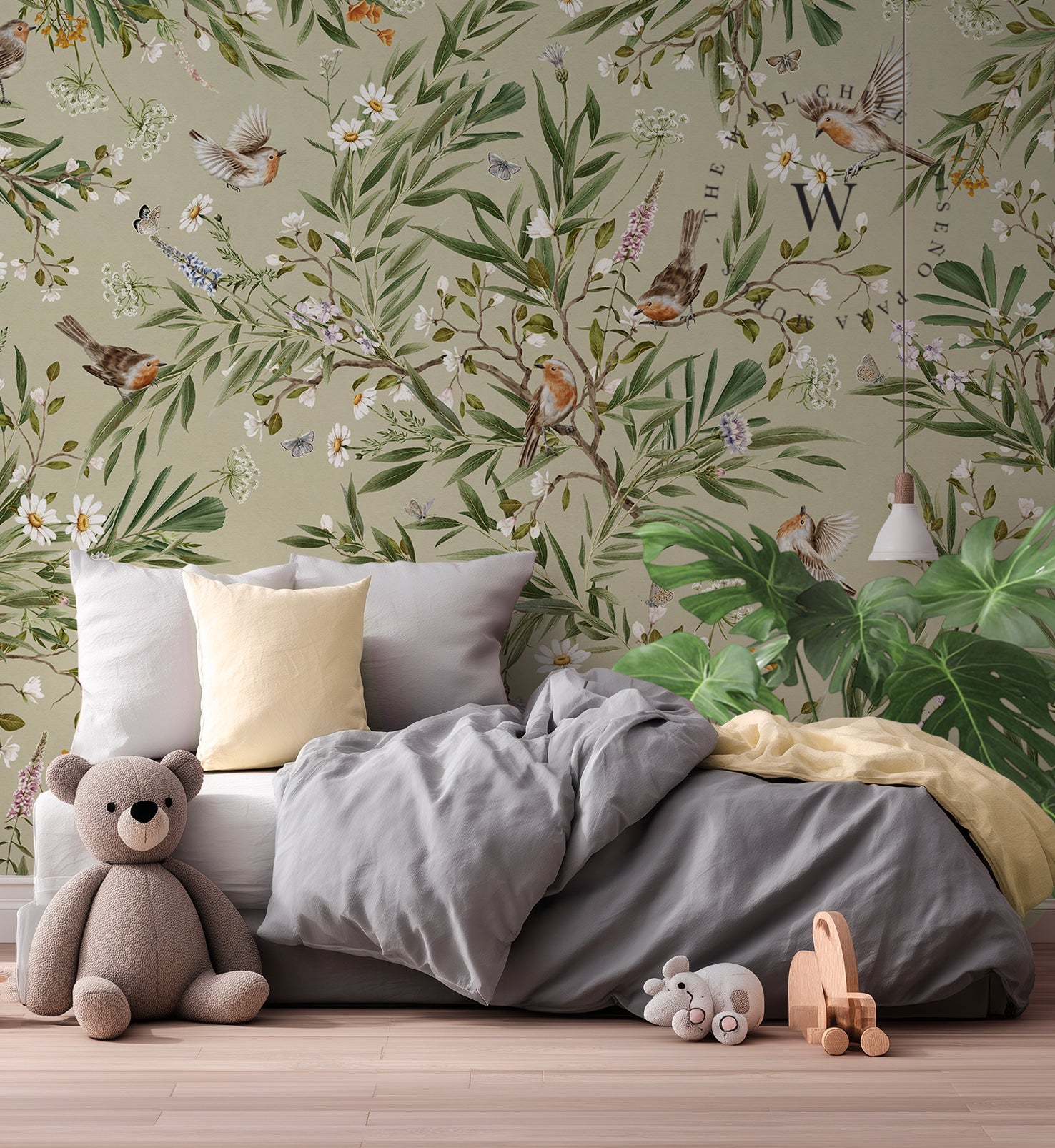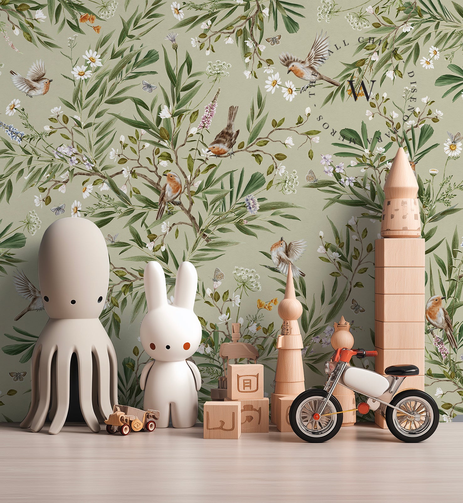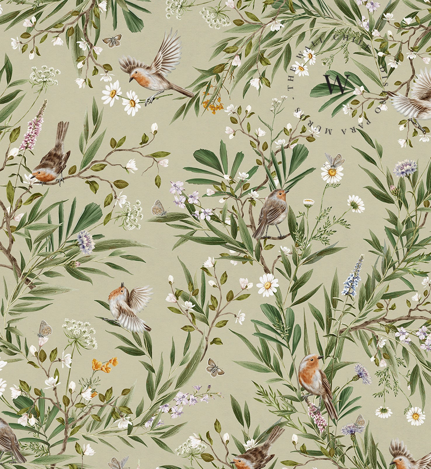 El papel mural Playful Robins – Green captura la poesía de la naturaleza en una composición delicada y luminosa. Sobre un fondo verde empolvado, ramas entrelazadas, flores silvestres y pequeños petirrojos dan vida a una escena primaveral llena de movimiento y armonía.