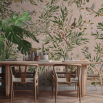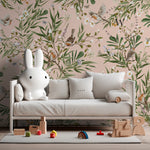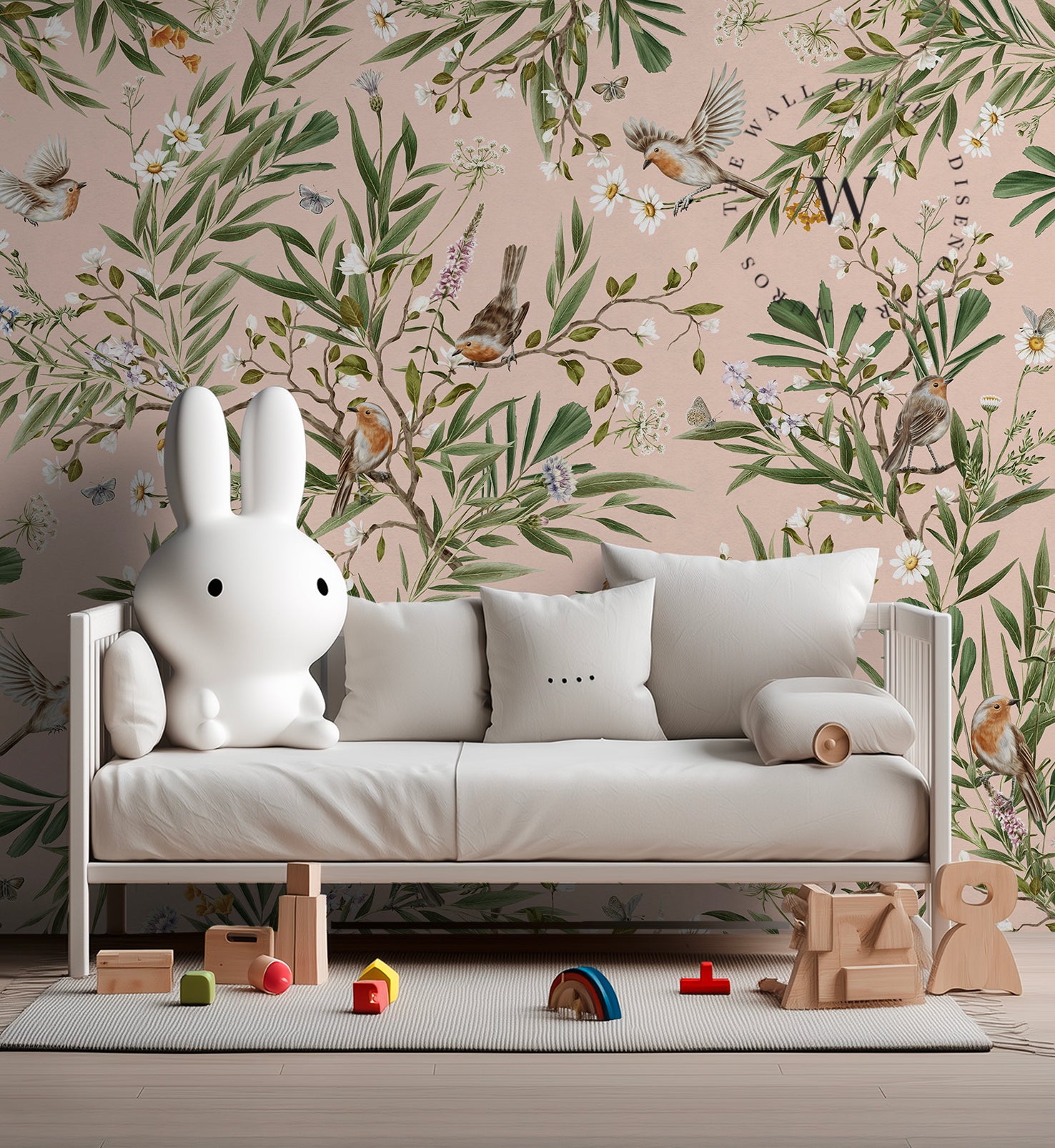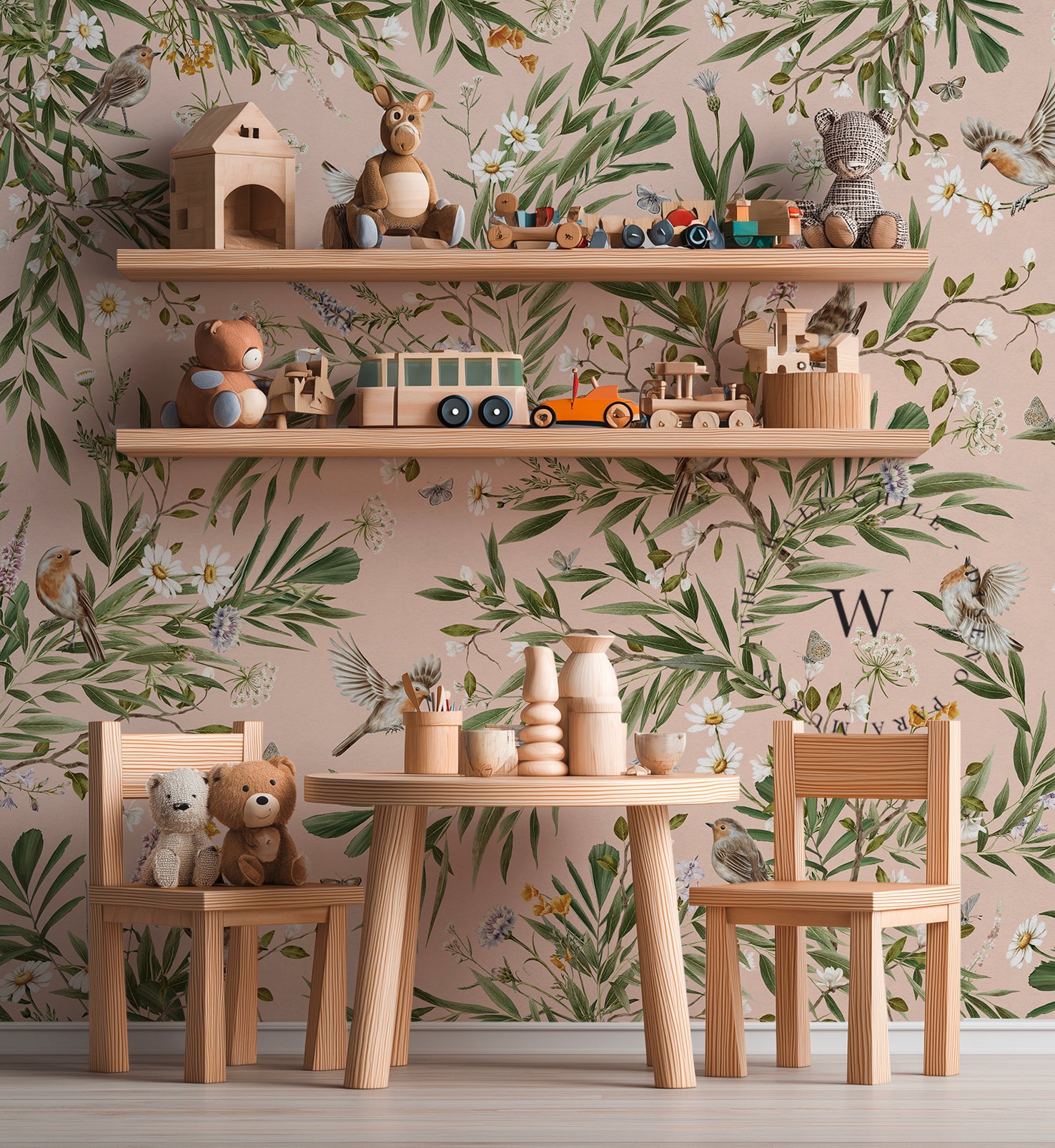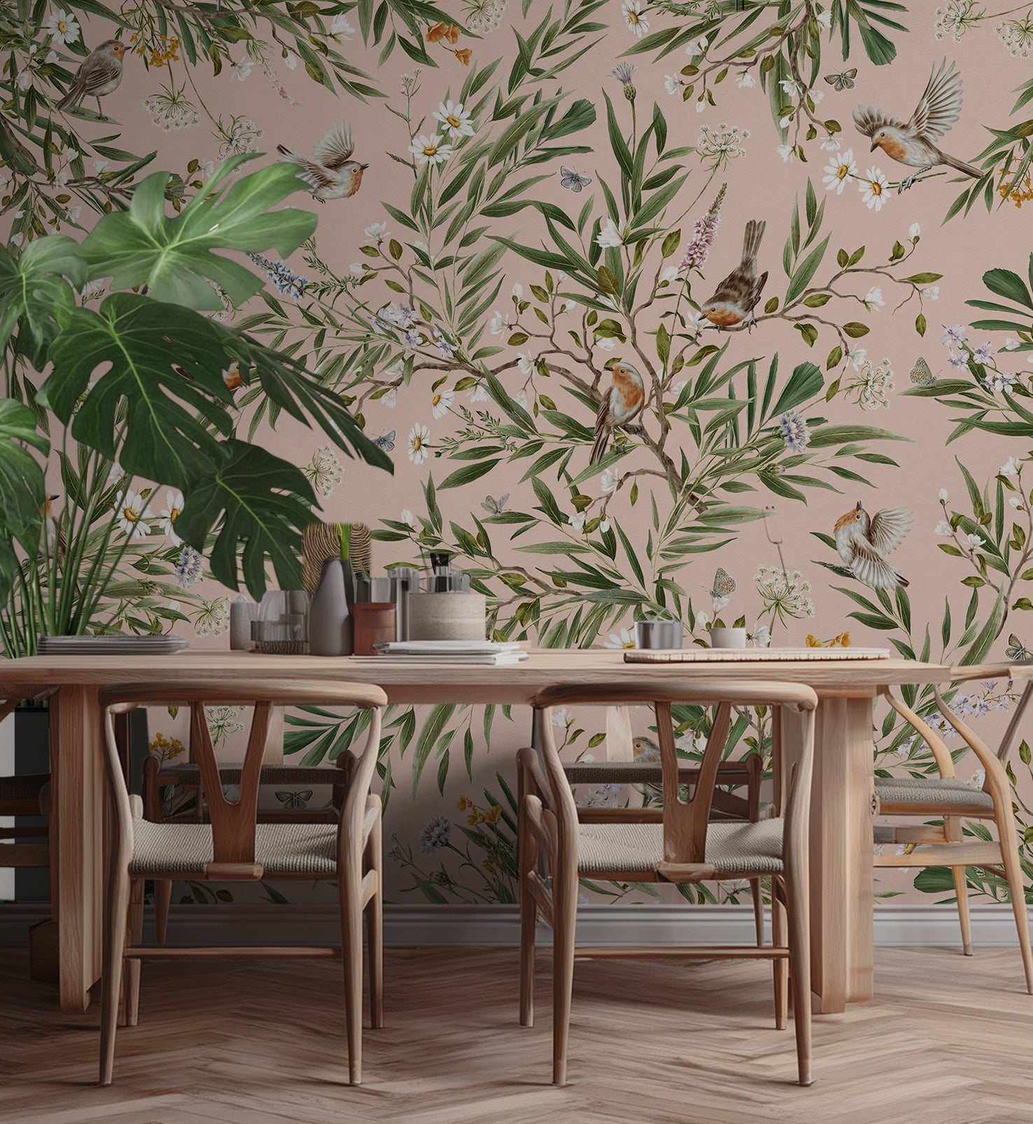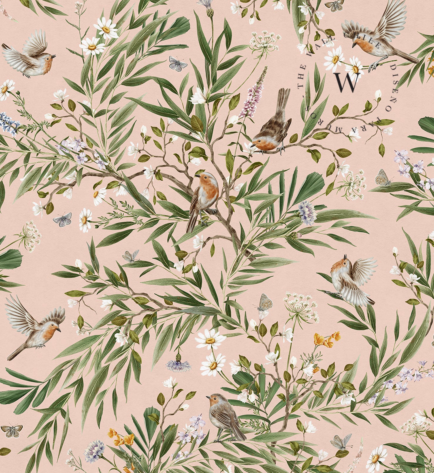 El papel mural Playful Robins – Pink captura la poesía de la naturaleza en una composición delicada y luminosa. Sobre un fondo rosa empolvado, ramas entrelazadas, flores silvestres y pequeños petirrojos dan vida a una escena primaveral llena de movimiento y armonía.