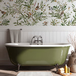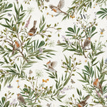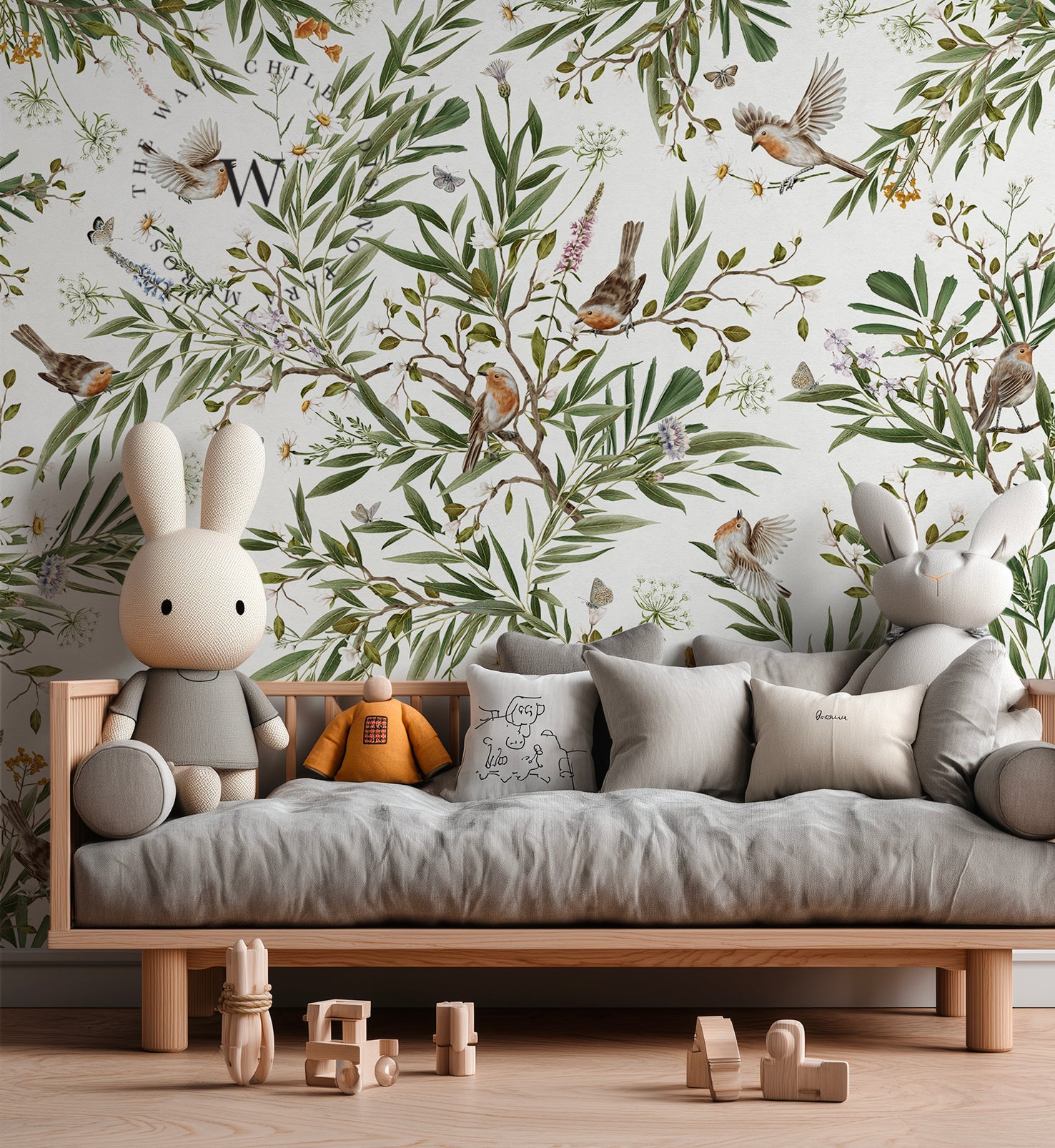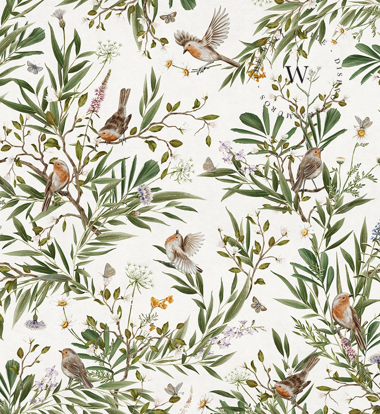 El papel mural Playful Robins – White captura la poesía de la naturaleza en una composición delicada y luminosa. Sobre un fondo verde empolvado, ramas entrelazadas, flores silvestres y pequeños petirrojos dan vida a una escena primaveral llena de movimiento y armonía.