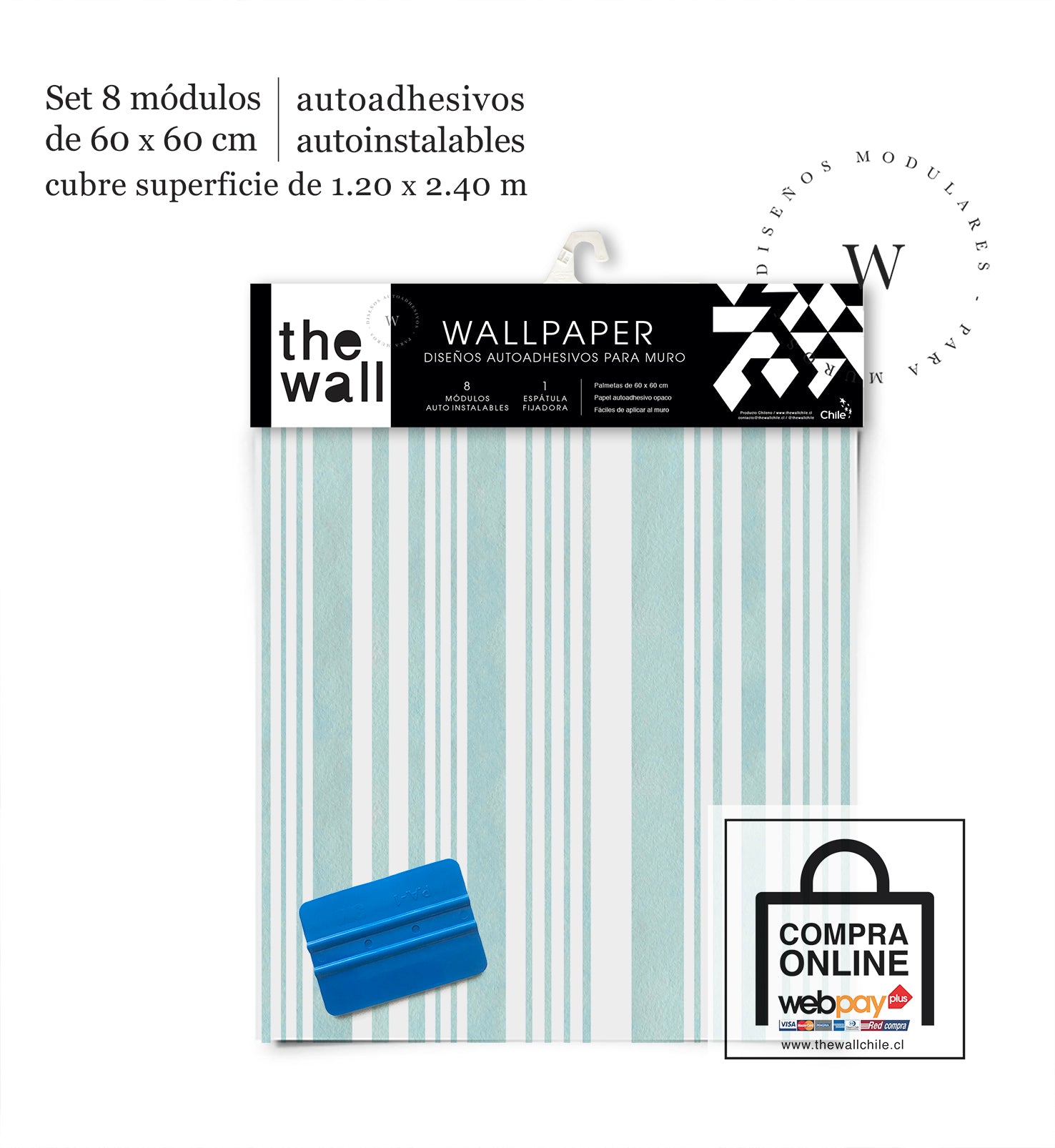 2. Set de Módulos: Módulos adhesivos y auto instalable de 60 x 60 cm que forman un patrón mayor de 1,2 x 2,4 mts (2,44 m2). Con paleta 3M para su perfecta aplicación.