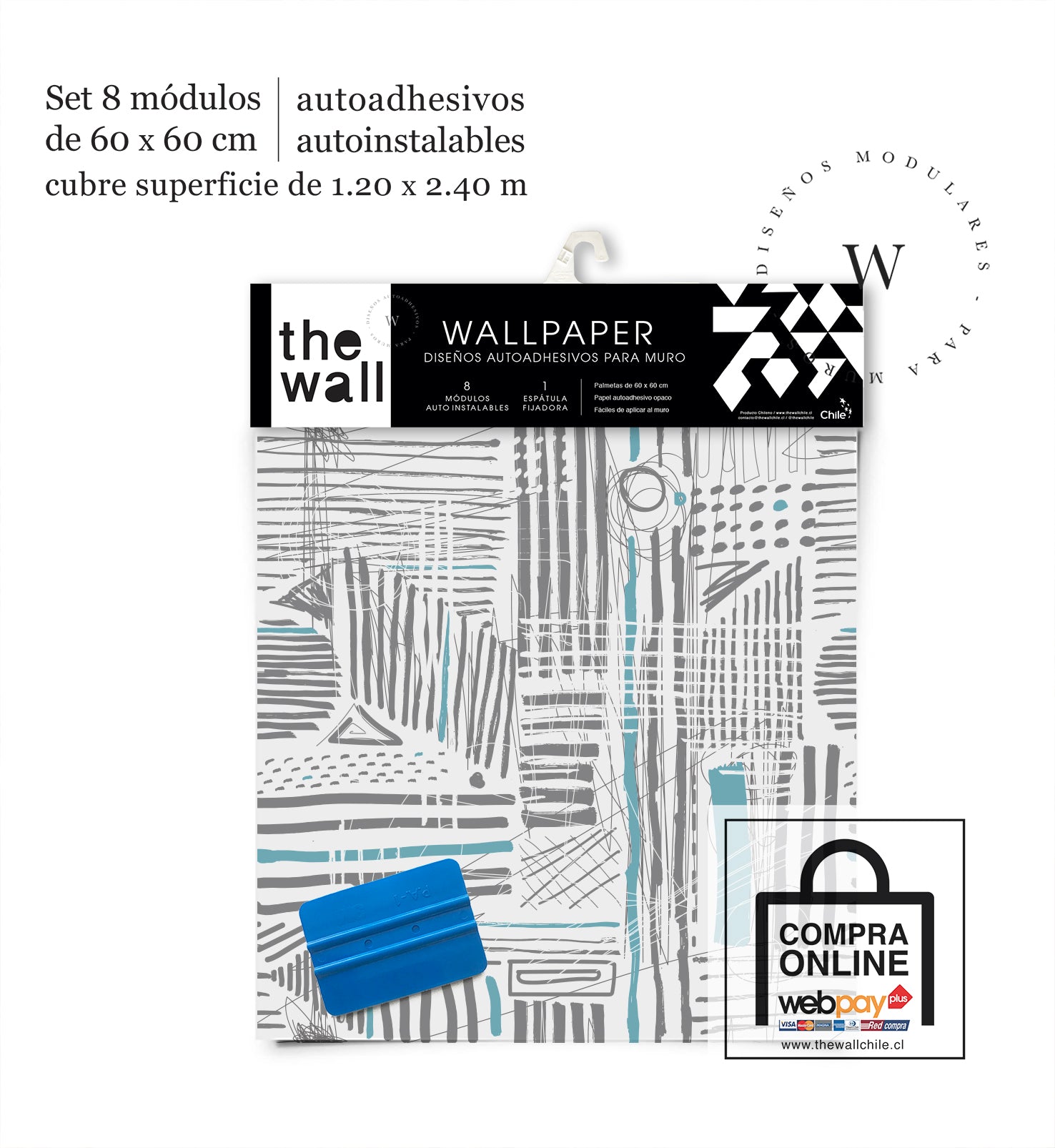 2. Set de Módulos: Módulos adhesivos y auto instalable de 60 x 60 cm que forman un patrón mayor de 1,2 x 2,4 mts (2,44 m2). Con paleta 3M para su perfecta aplicación.