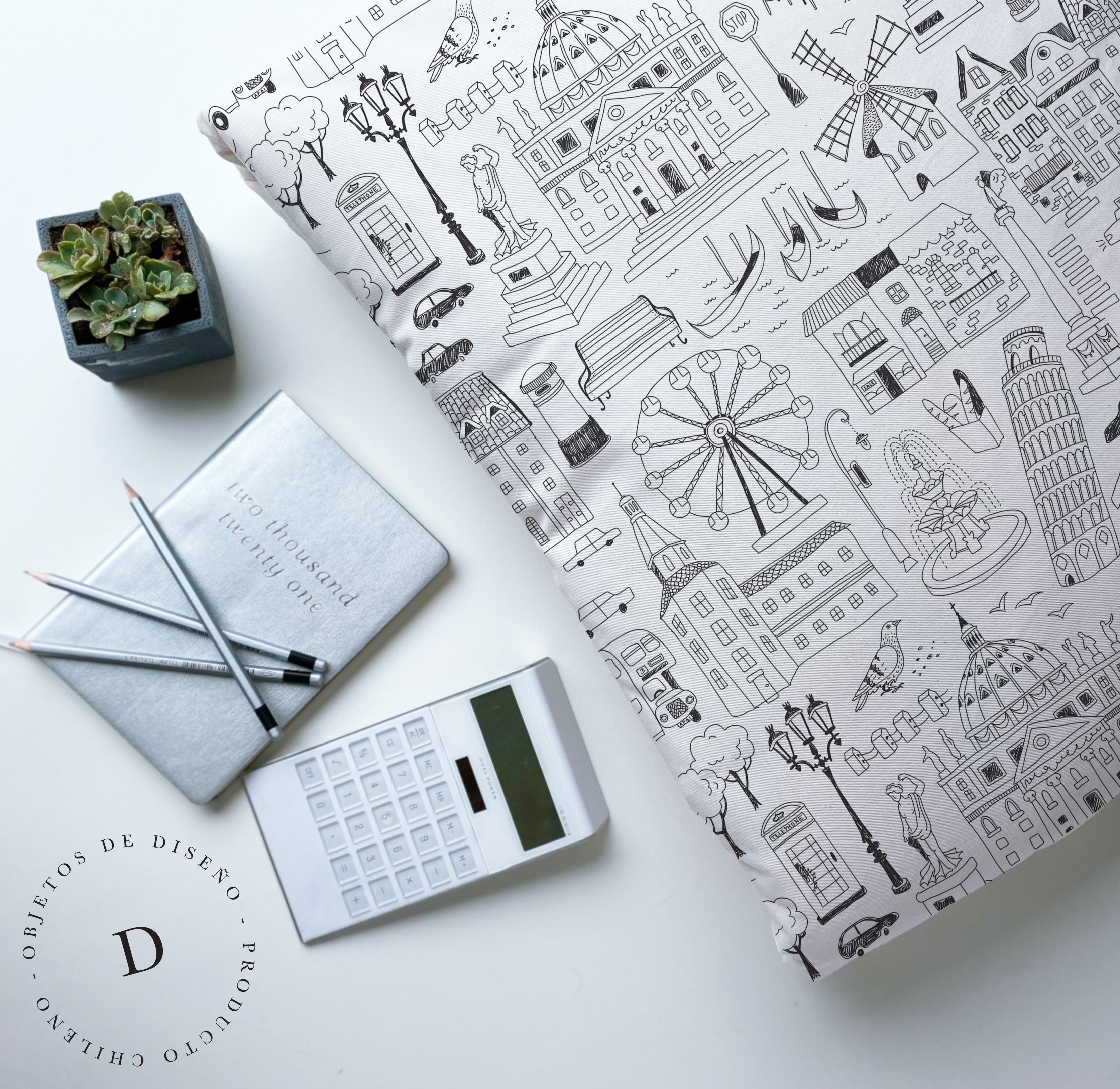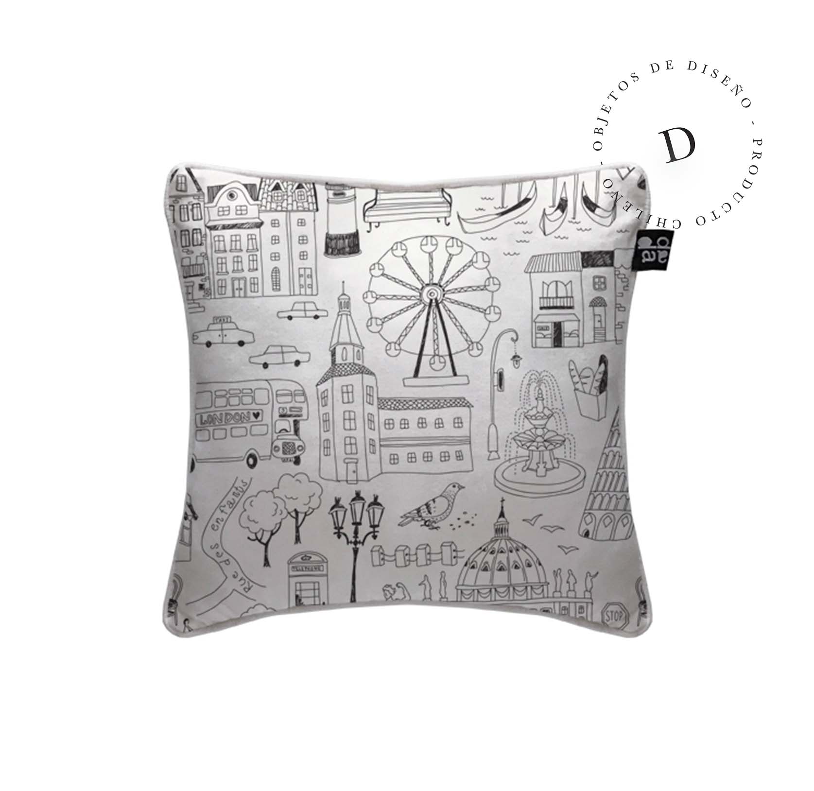 1. Cojín 45 x 45 cm: Diseño por ambos lados, con cordón perimetral, cierre invisible, relleno algodón sintético removible.