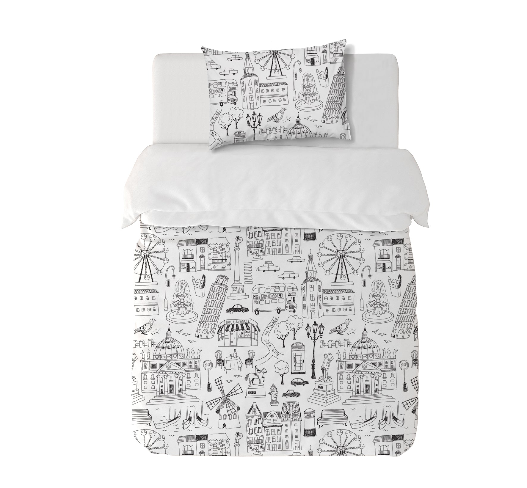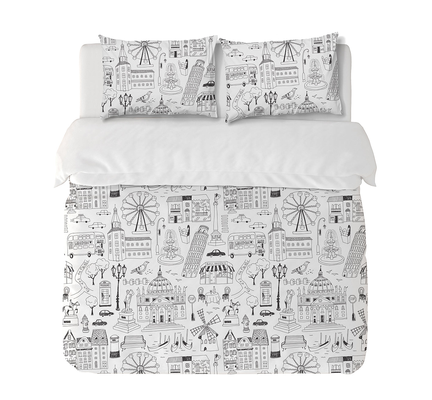12. Funda de plumón Super King 280 x 245 cm: Funda plumón, diseño por una cara, reverso liso con cierre invisible en la parte inferior + 2 fundas de almohadas 90 x 50 cm con cierre invisible. No incluye rellenos.