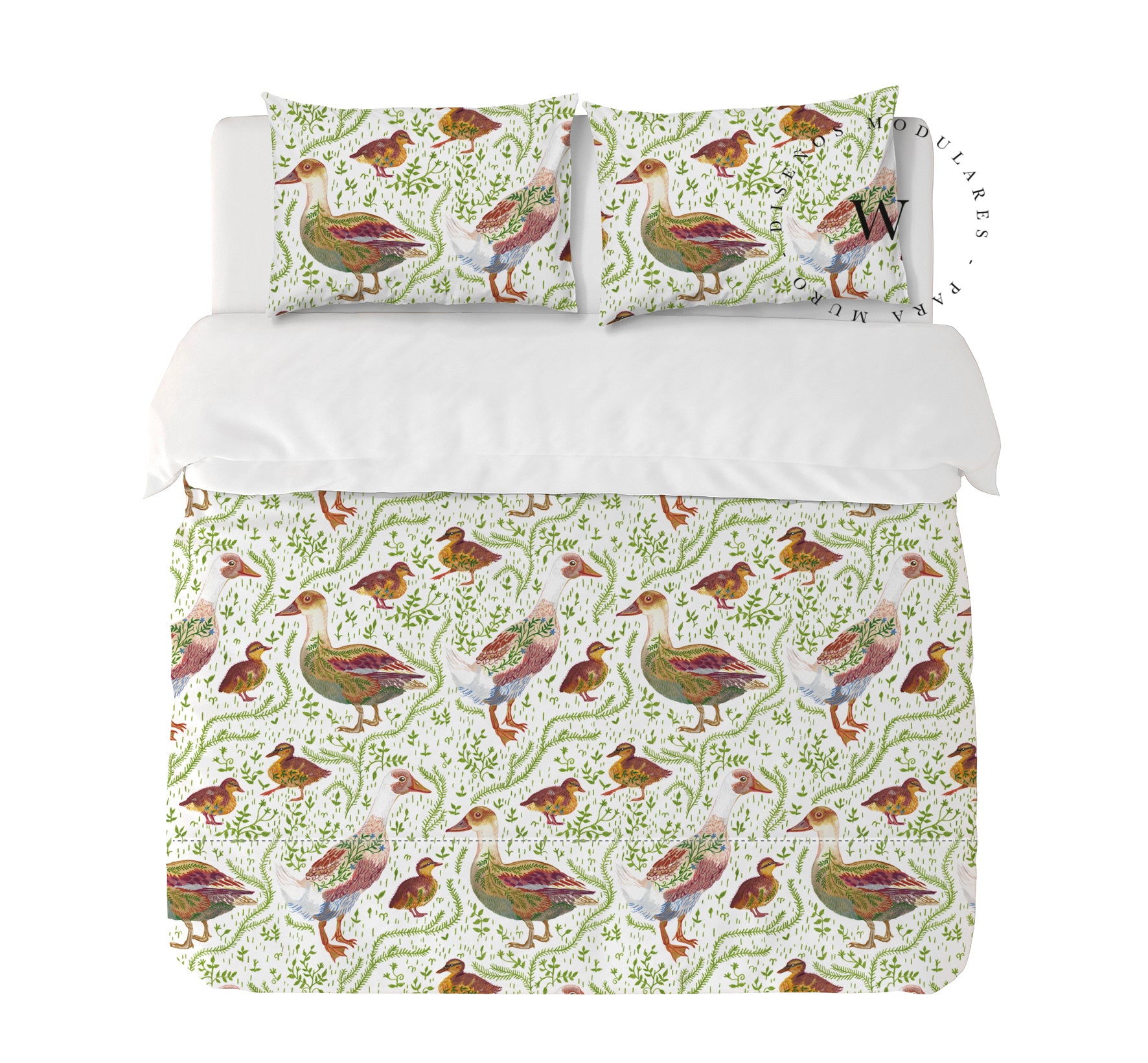 11. Funda de plumón King 270 x 245 cm: Funda plumón, diseño por una cara, reverso liso con cierre invisible en la parte inferior + 2 fundas de almohadas 90 x 50 cm con cierre invisible. No incluye rellenos.