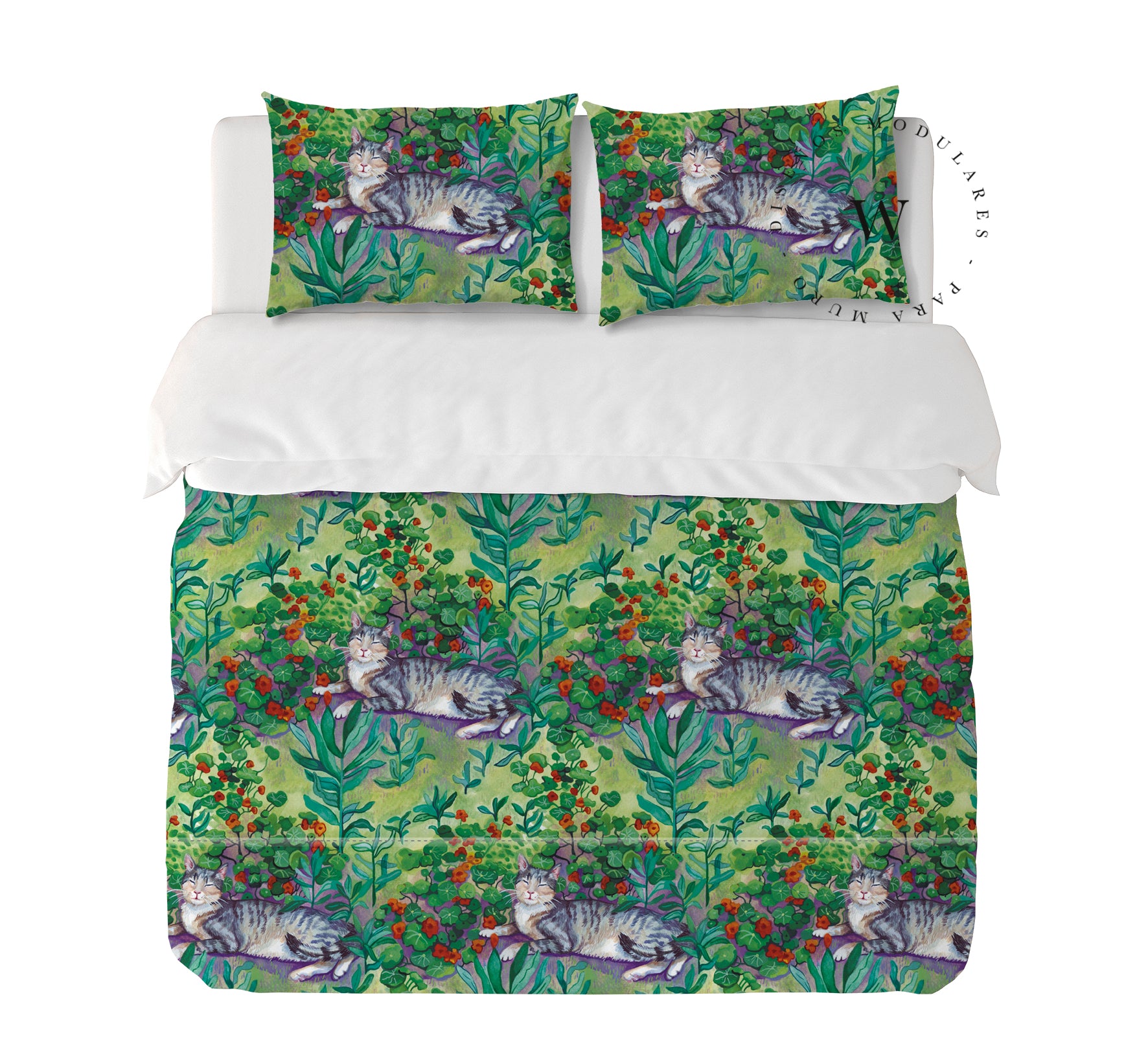 11. Funda de plumón King 270 x 245 cm: Funda plumón, diseño por una cara, reverso liso con cierre invisible en la parte inferior + 2 fundas de almohadas 90 x 50 cm con cierre invisible. No incluye rellenos.