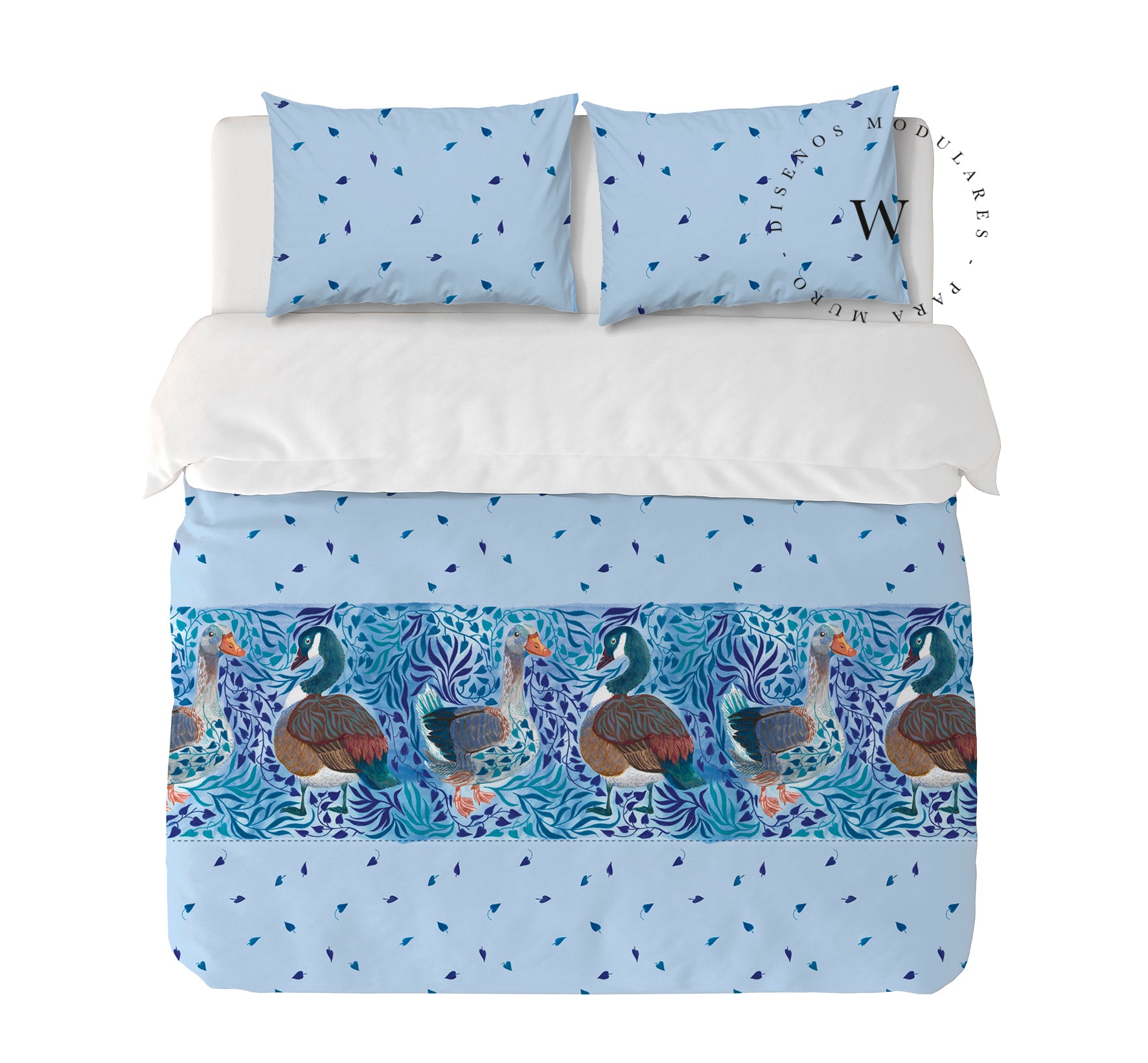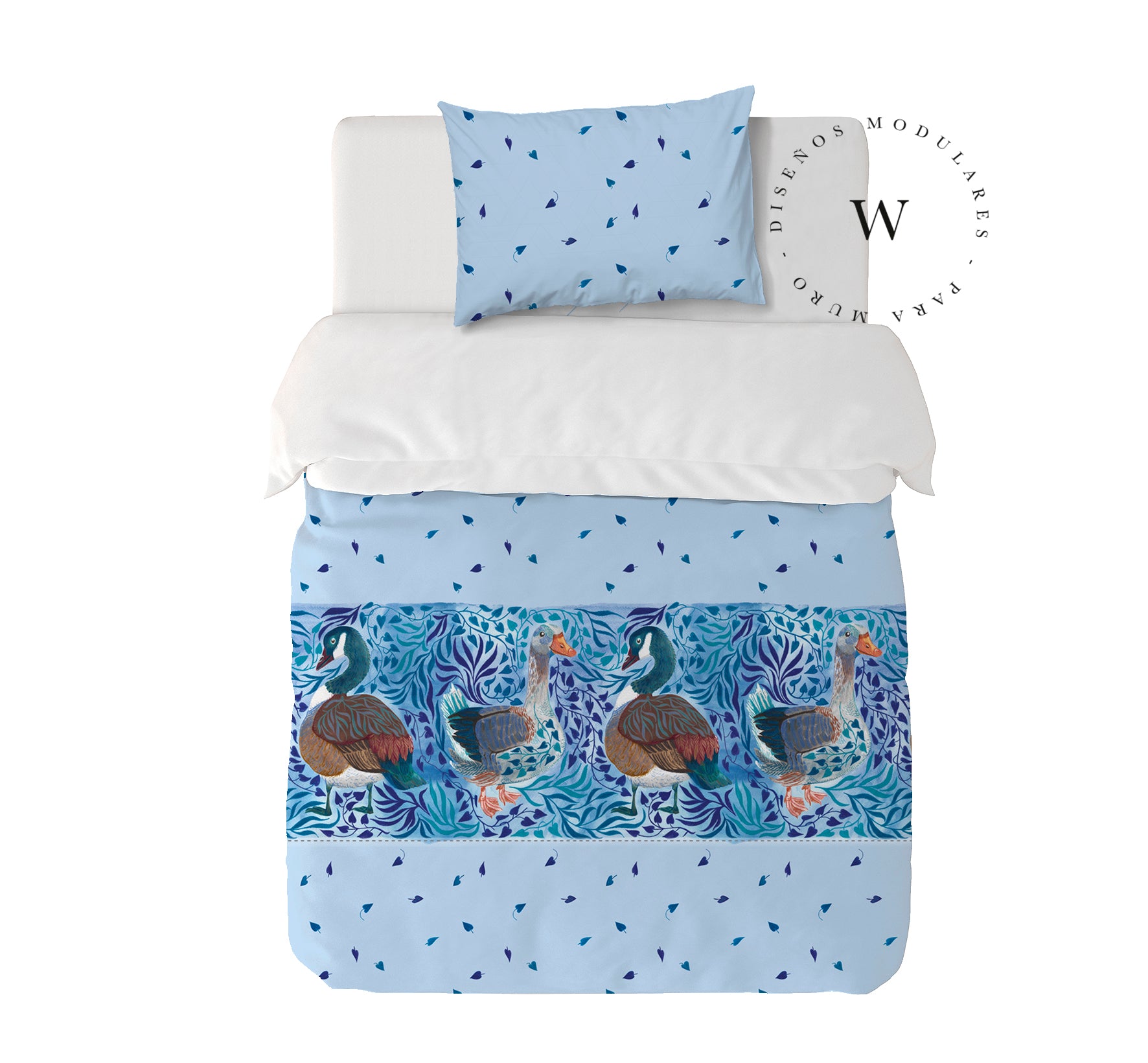 11. Funda de plumón King 270 x 245 cm: Funda plumón, diseño por una cara, reverso liso con cierre invisible en la parte inferior + 2 fundas de almohadas 90 x 50 cm con cierre invisible. No incluye rellenos.