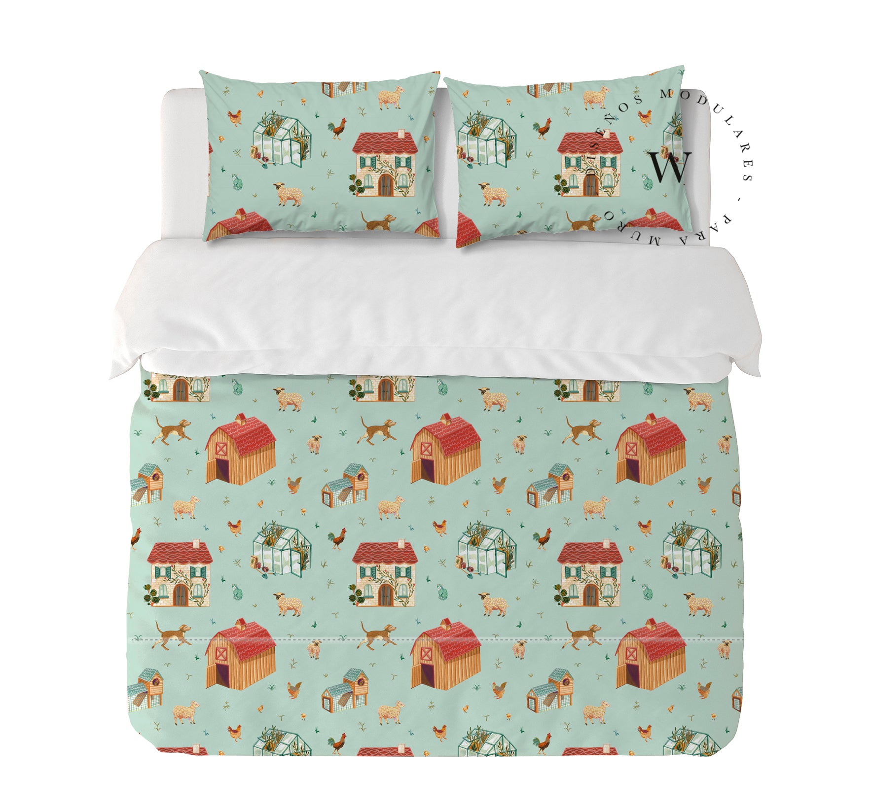 11. Funda de plumón King 270 x 245 cm: Funda plumón, diseño por una cara, reverso liso con cierre invisible en la parte inferior + 2 fundas de almohadas 90 x 50 cm con cierre invisible. No incluye rellenos.