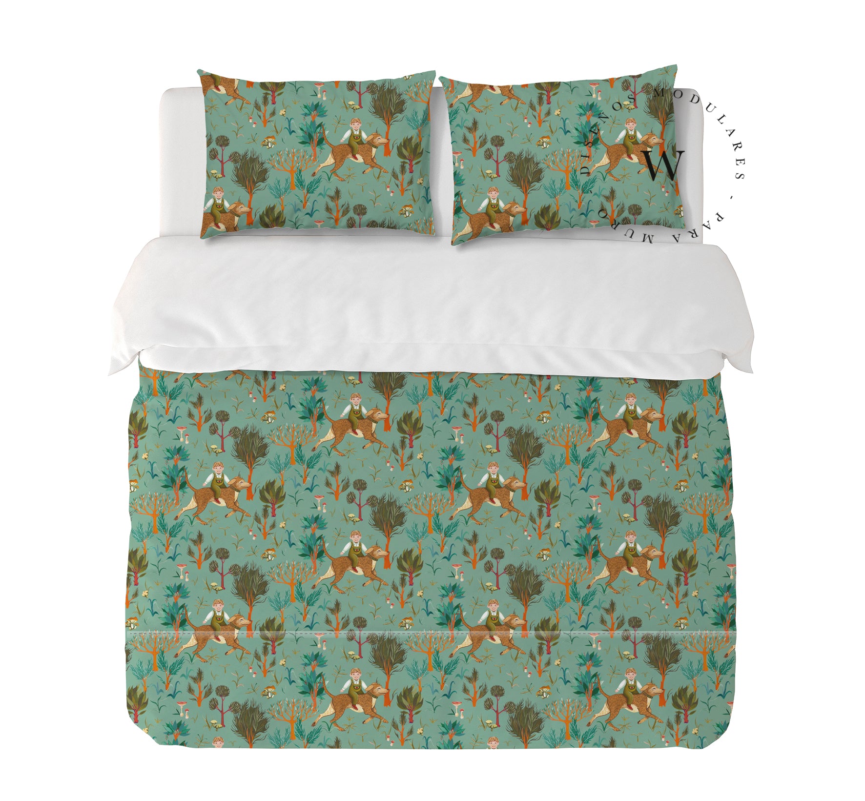 11. Funda de plumón King 270 x 245 cm: Funda plumón, diseño por una cara, reverso liso con cierre invisible en la parte inferior + 2 fundas de almohadas 90 x 50 cm con cierre invisible. No incluye rellenos.