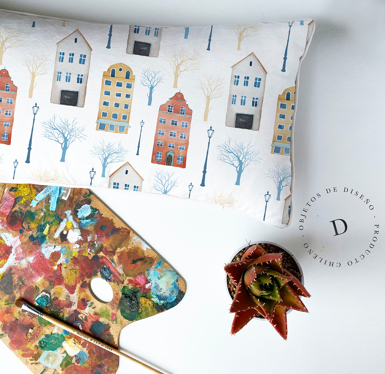 2. Cojín 60 x 40 cm: Diseño por ambos lados, con cordón perimetral, cierre invisible, relleno algodón sintético removible.