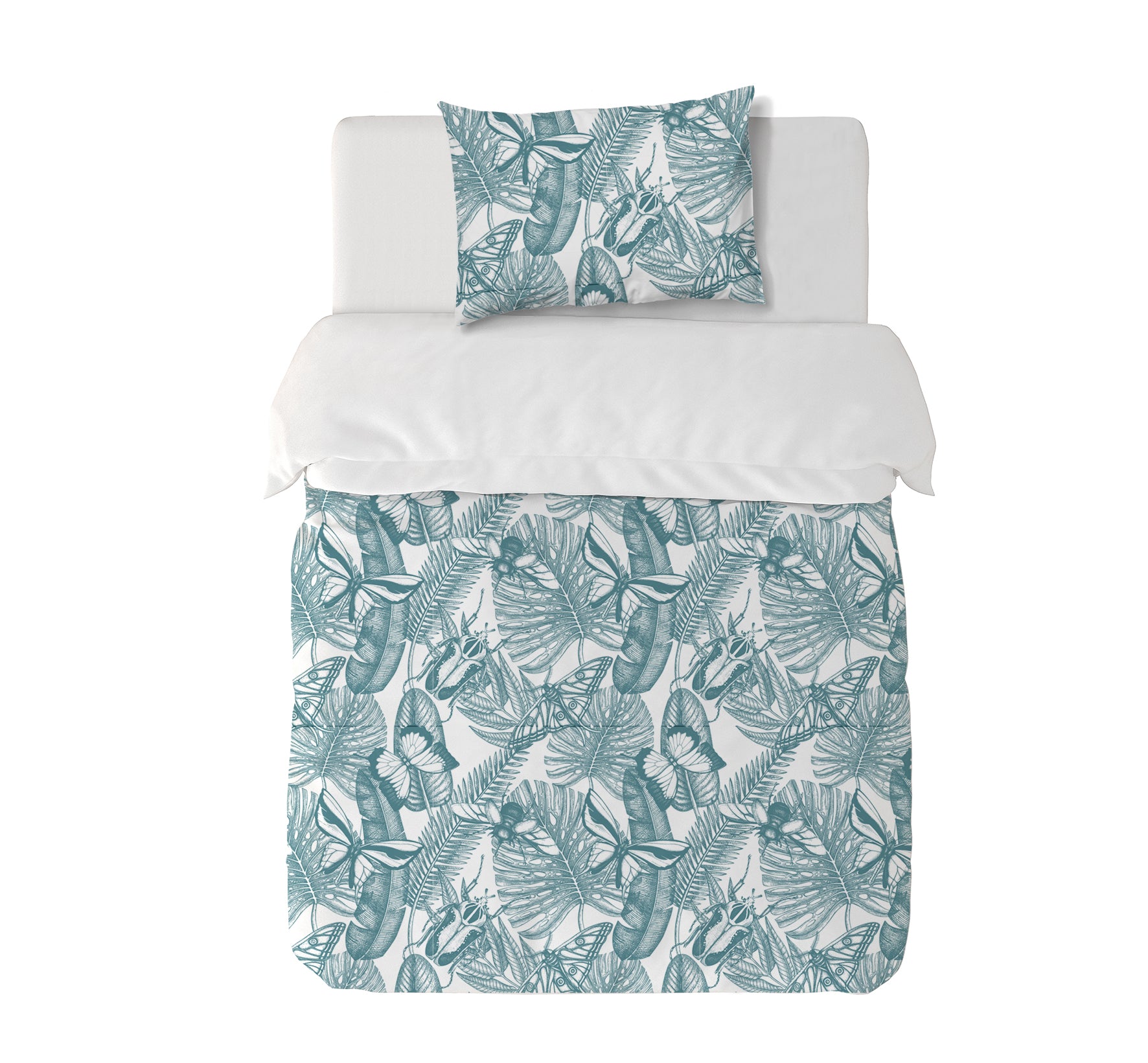 8. Funda de plumón 1 Plaza 150 x 240 cm: Funda plumón, diseño por una cara, reverso liso con cierre invisible en la parte inferior + 1 funda de almohada 70 x 50 cm con cierre invisible. No incluye rellenos.