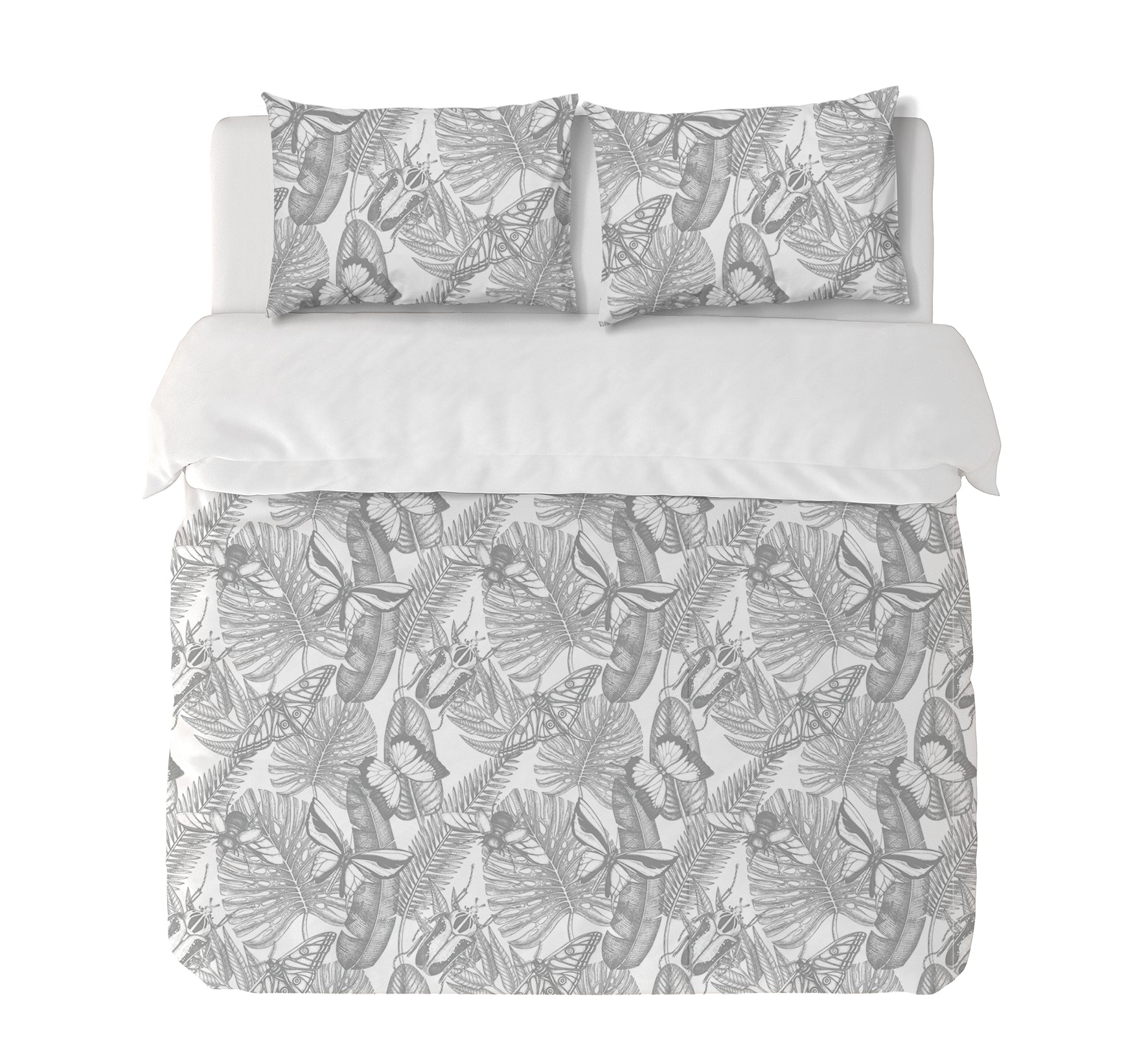 10. Funda de plumón Queen 240 x 245 cm: Funda plumón, diseño por una cara, reverso liso con cierre invisible en la parte inferior + 2 fundas de almohadas 70 x 50 cm con cierre invisible. No incluye rellenos.