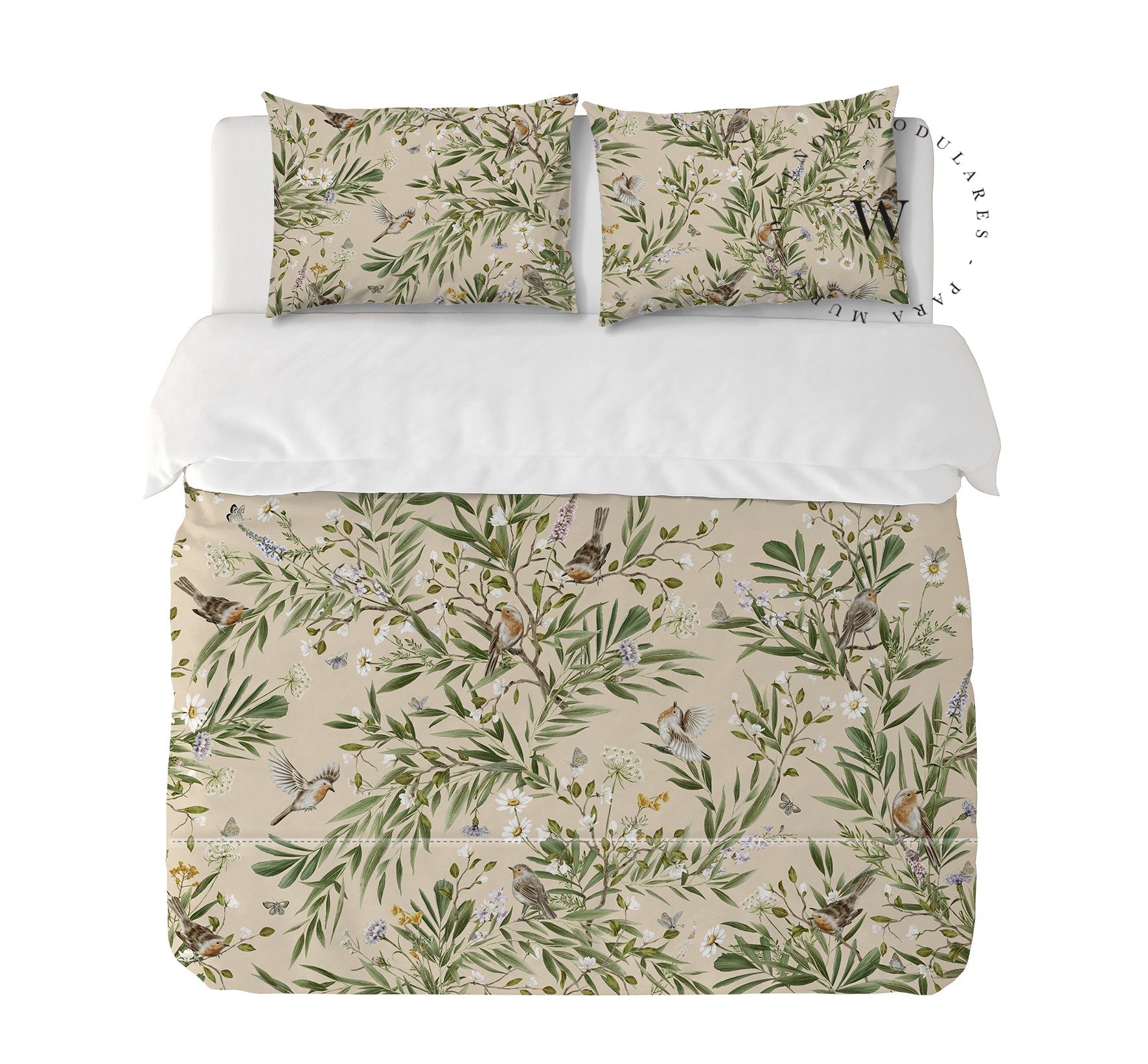 10. Funda de plumón Queen 240 x 245 cm: Funda plumón, diseño por una cara, reverso liso con cierre invisible en la parte inferior + 2 fundas de almohadas 70 x 50 cm con cierre invisible. No incluye rellenos.