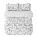 11. Funda de plumón King 270 x 245 cm: Funda plumón, diseño por una cara, reverso liso con cierre invisible en la parte inferior + 2 fundas de almohadas 90 x 50 cm con cierre invisible. No incluye rellenos.
