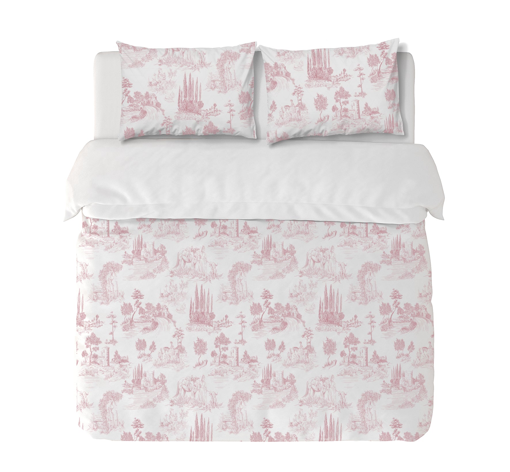 11. Funda de plumón King 270 x 245 cm: Funda plumón, diseño por una cara, reverso liso con cierre invisible en la parte inferior + 2 fundas de almohadas 90 x 50 cm con cierre invisible. No incluye rellenos.