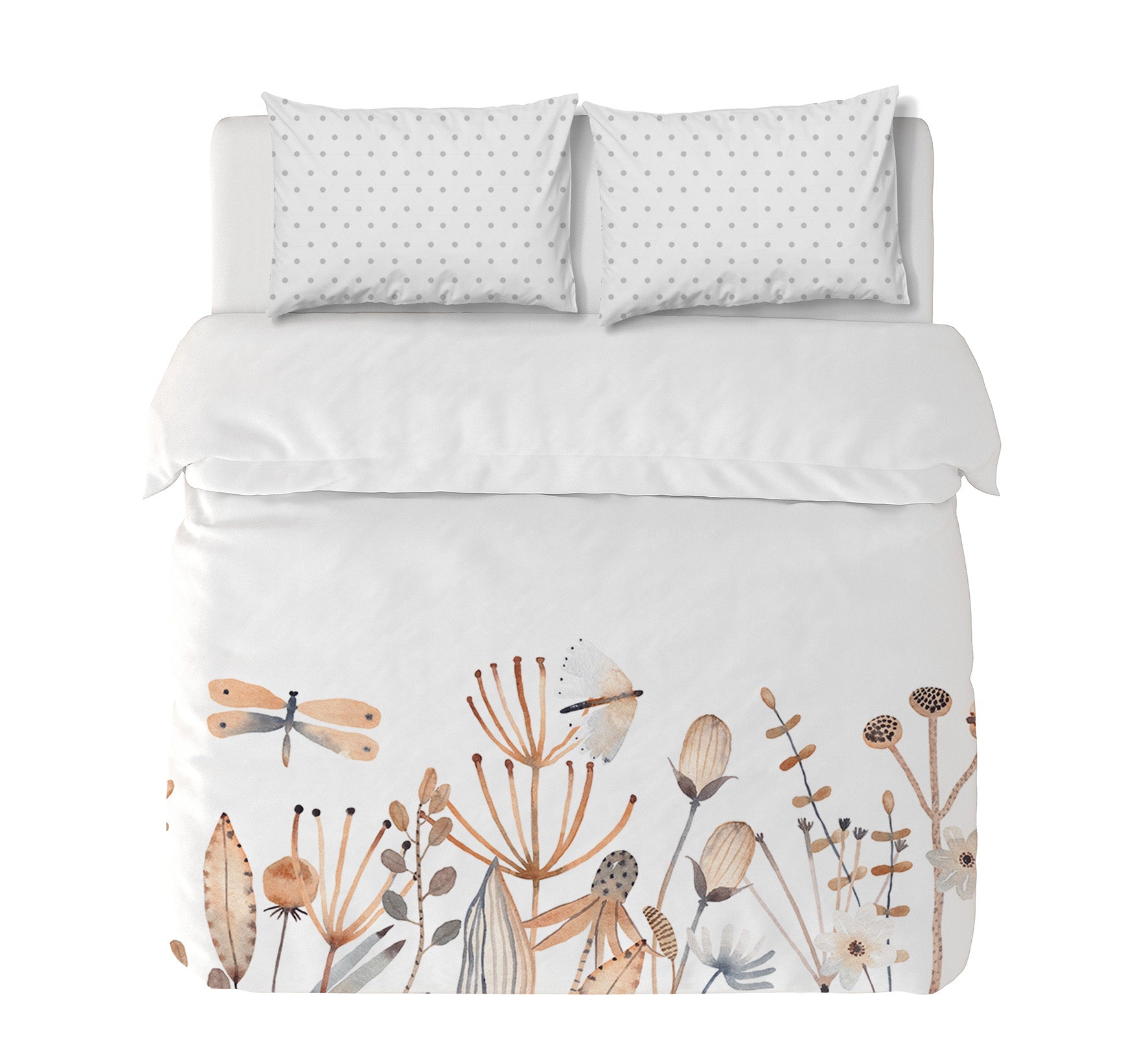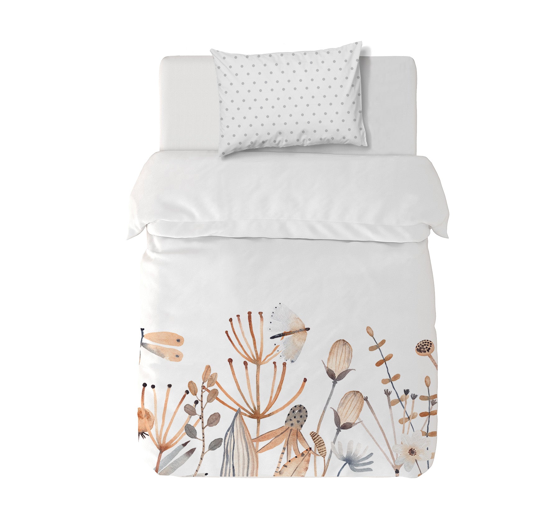 11. Funda de plumón King 270 x 245 cm: Funda plumón, diseño por una cara, reverso liso con cierre invisible en la parte inferior + 2 fundas de almohadas 90 x 50 cm con cierre invisible. No incluye rellenos.