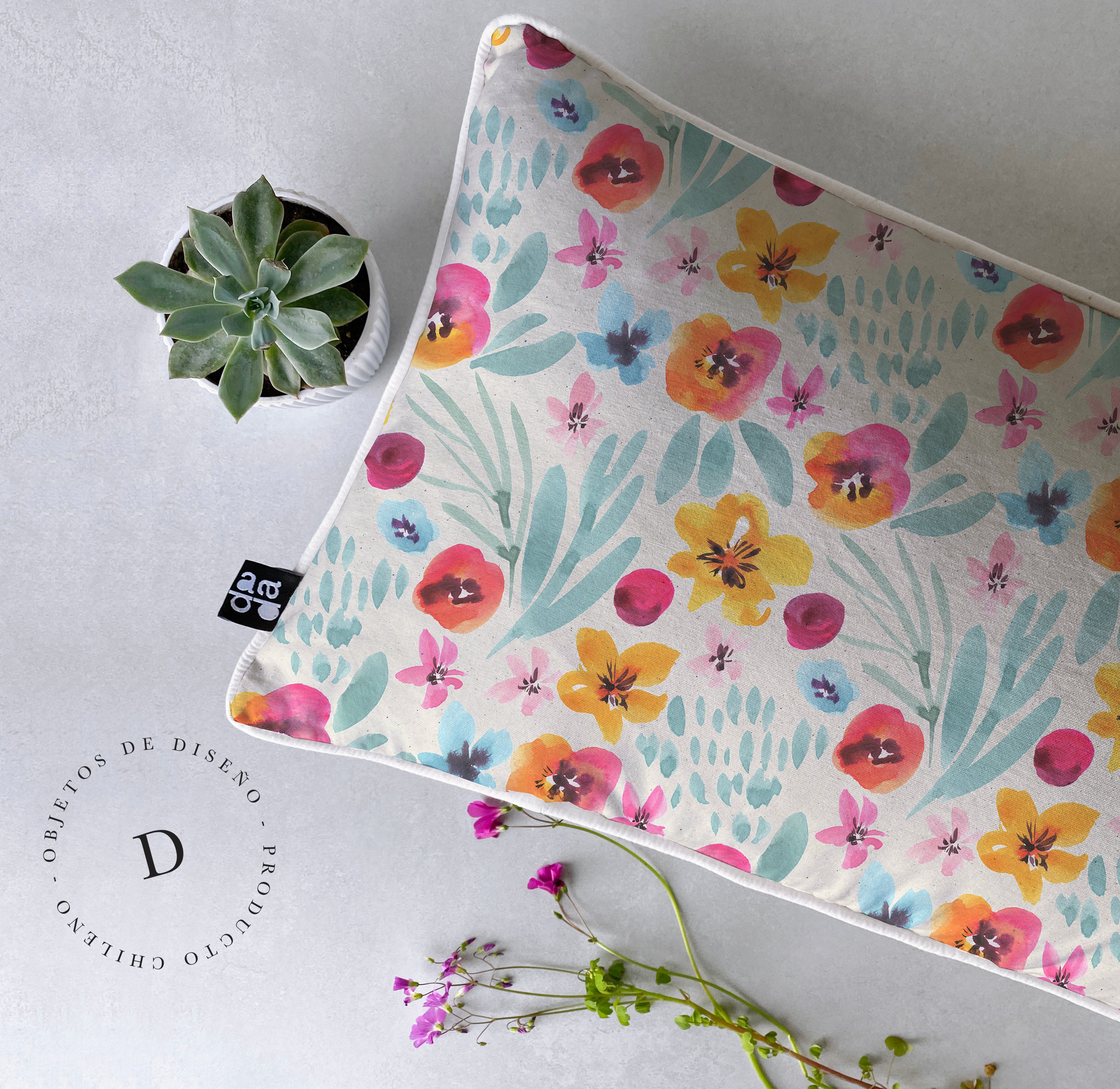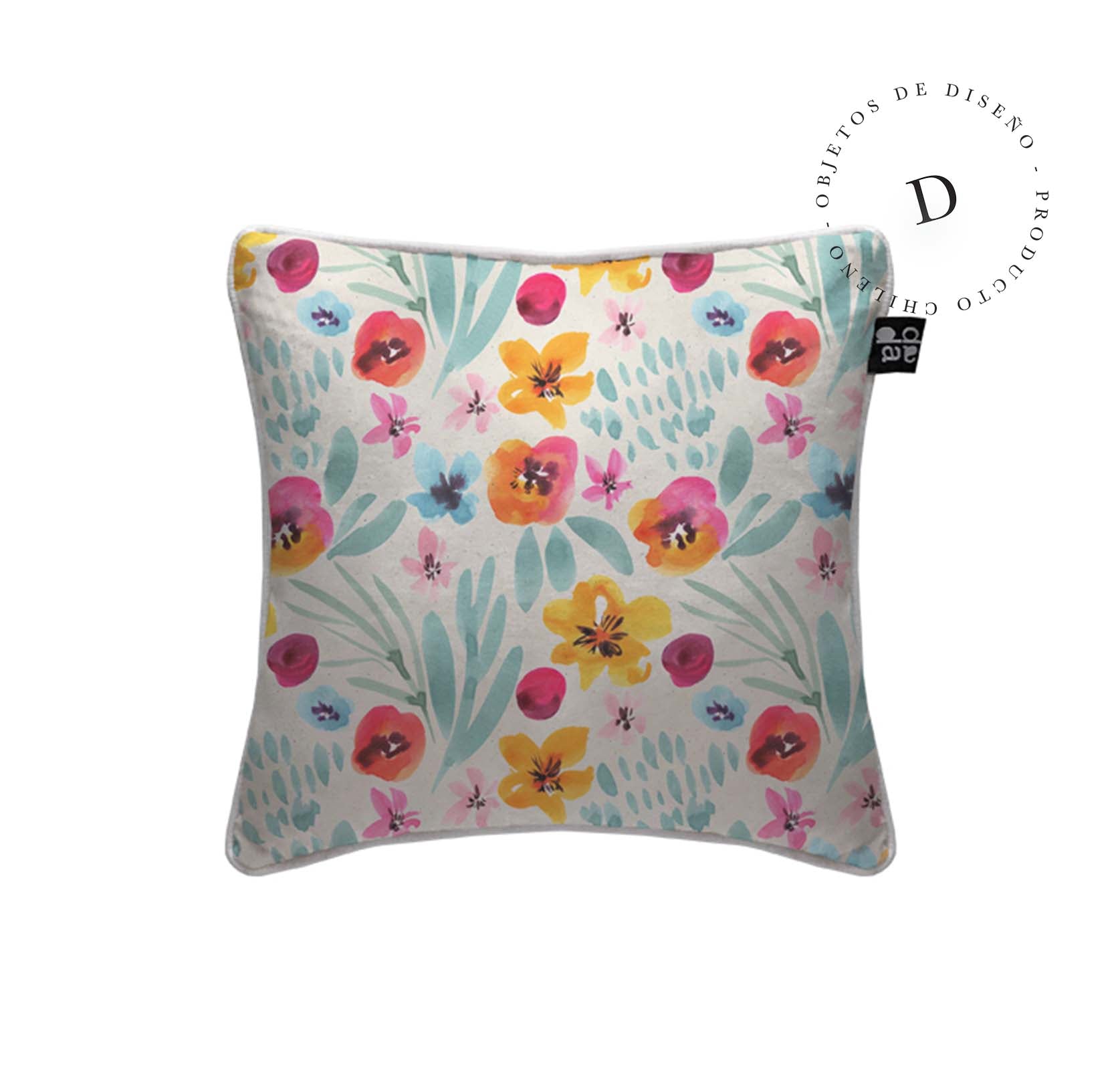 1. Cojín 45 x 45 cm: Diseño por ambos lados, con cordón perimetral, cierre invisible, relleno algodón sintético removible.