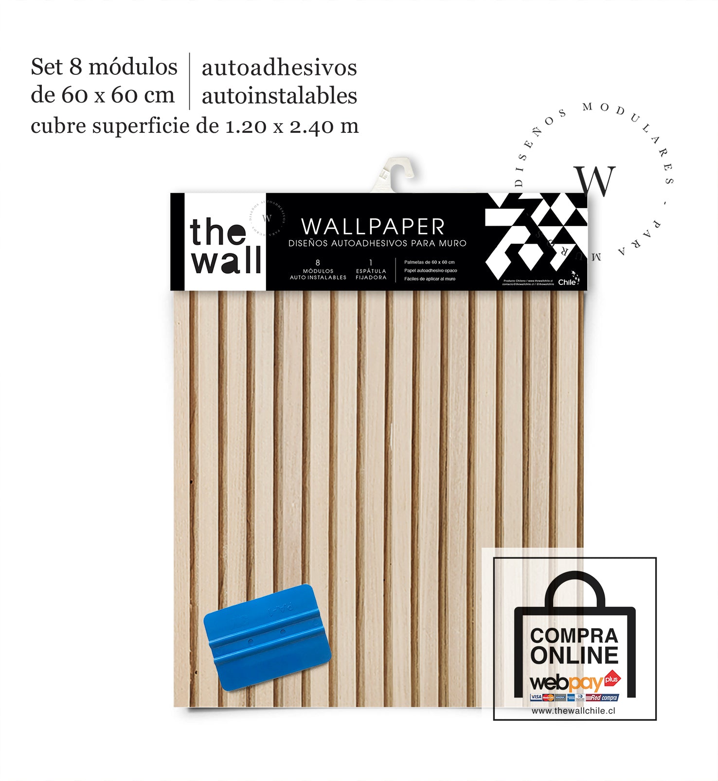 2. Set de Módulos: Módulos adhesivos y auto instalable de 60 x 60 cm que forman un patrón mayor de 1,2 x 2,4 mts (2,44 m2). Con paleta 3M para su perfecta aplicación.