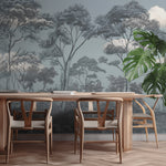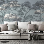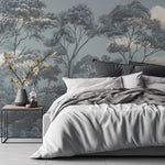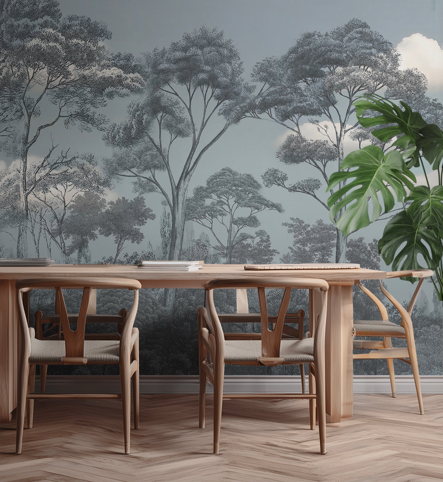 Bucolic Landscape es un papel mural de inspiración naturalista que retrata un bosque envuelto en bruma, con árboles esbeltos y nubes suaves que evocan serenidad.
