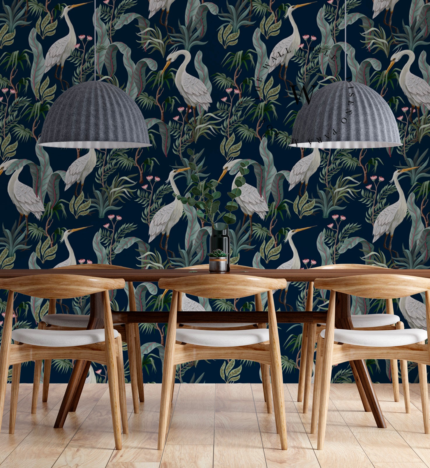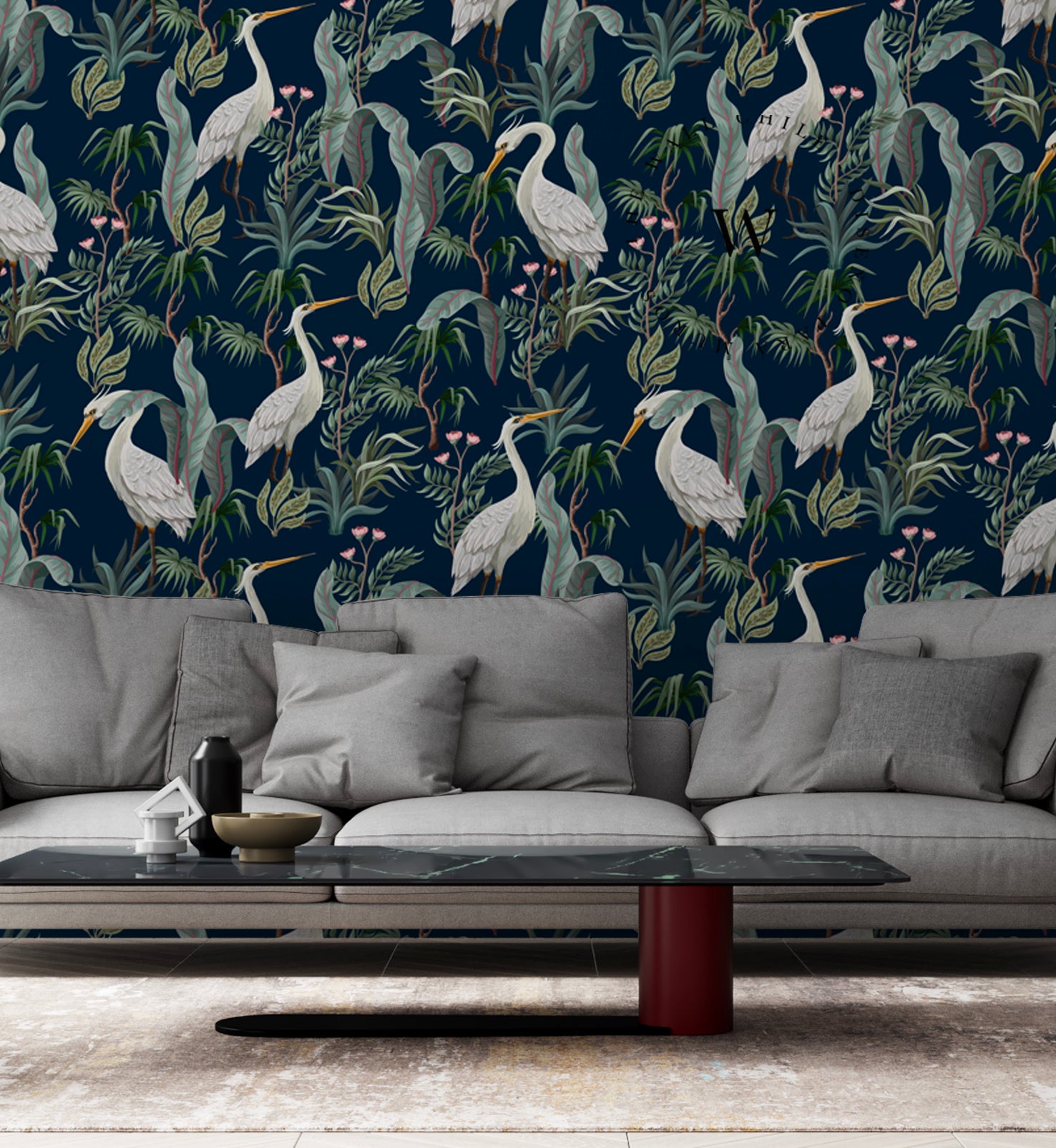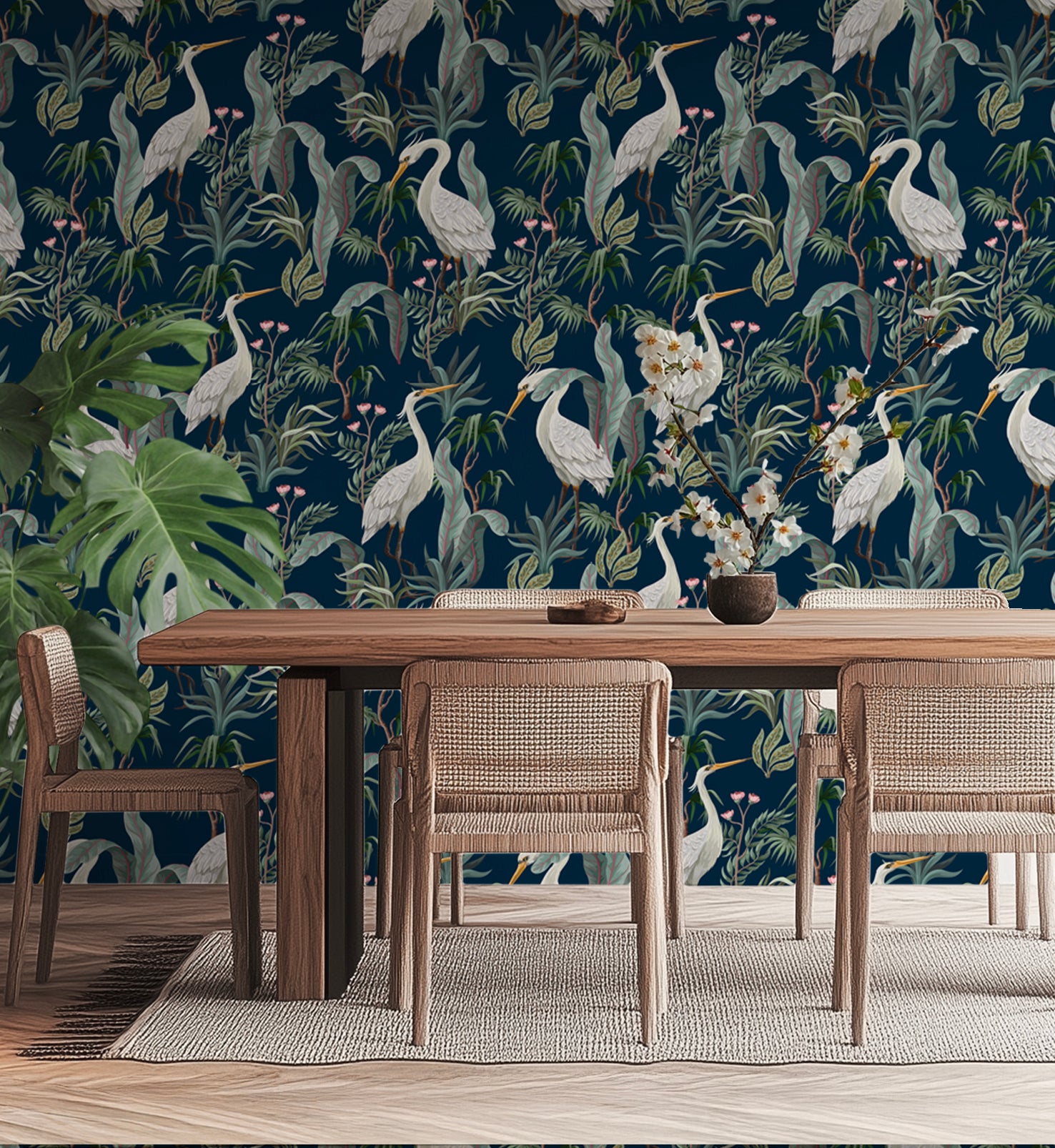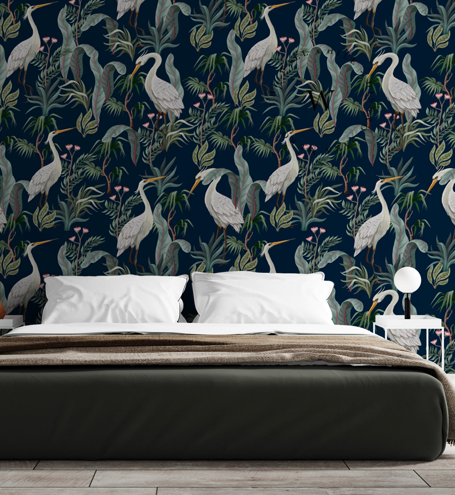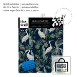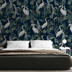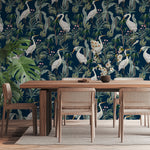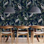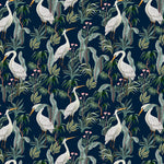 Heron es un papel mural de estilo tropical contemporáneo que combina la elegancia de las garzas blancas con una exuberante vegetación sobre un fondo azul profundo.