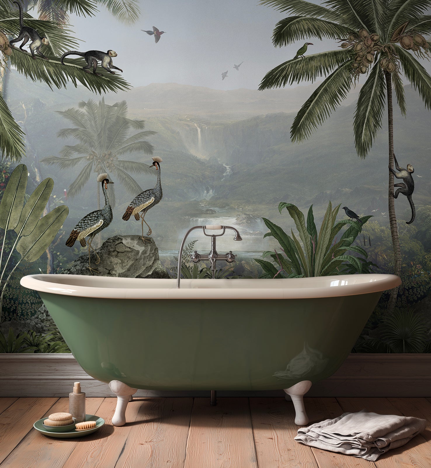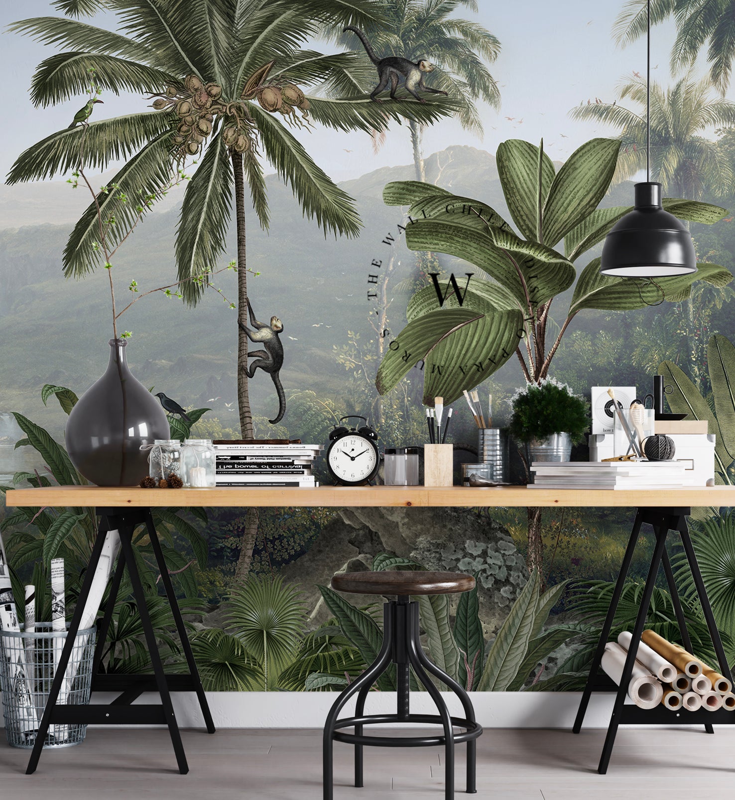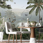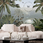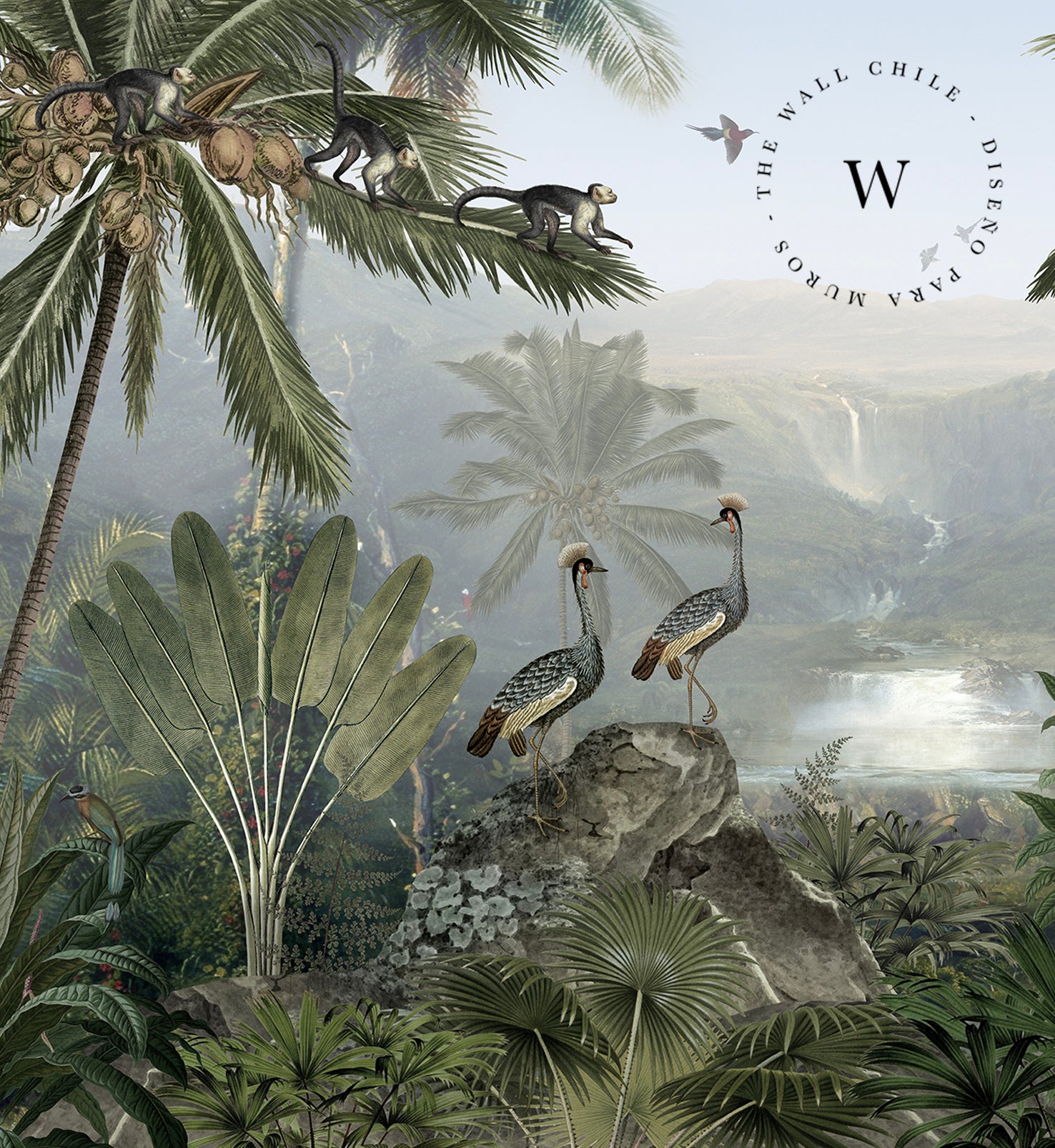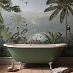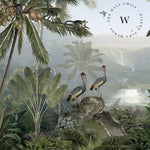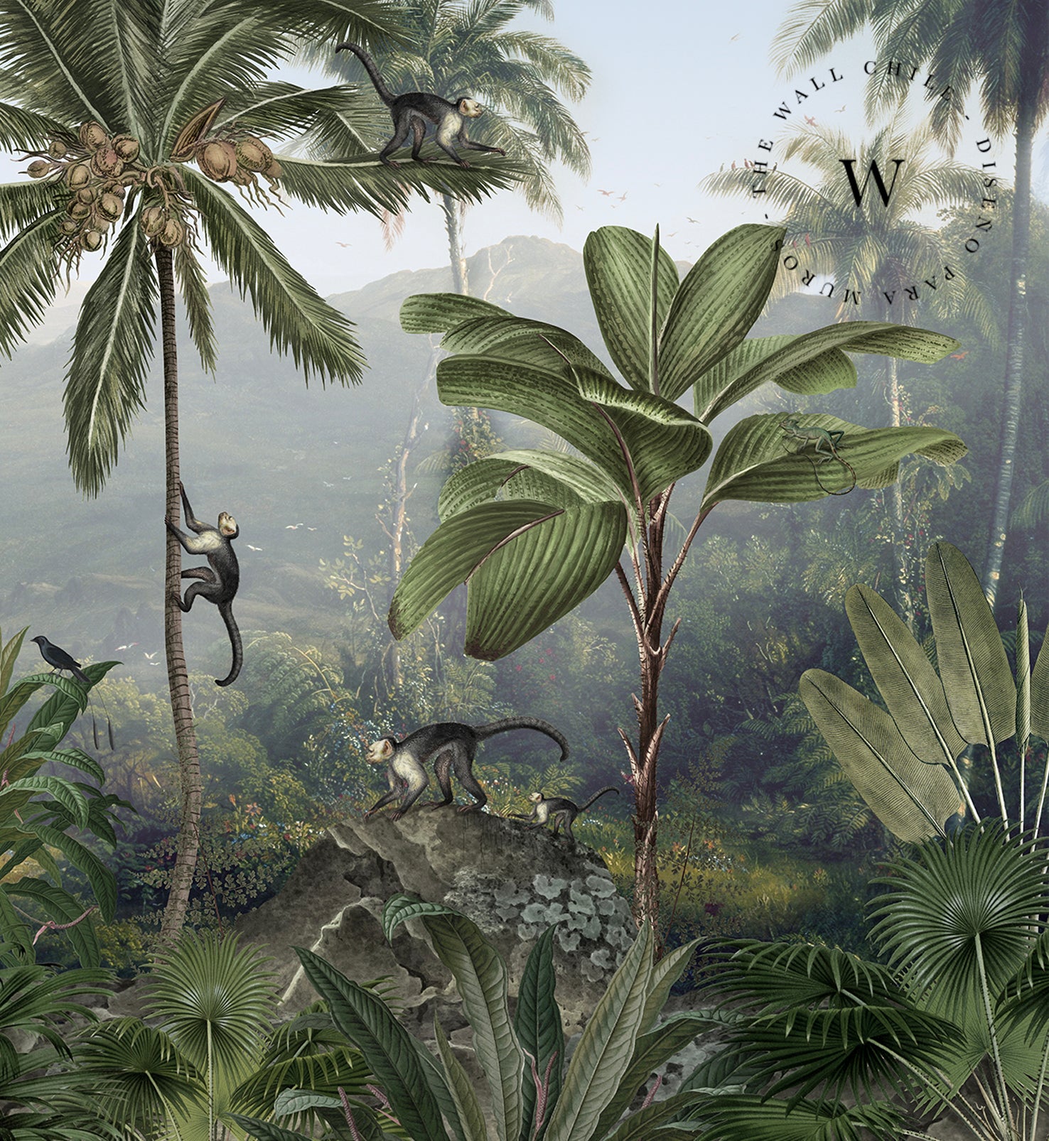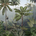 Monkey Sanctuary es un papel mural que captura la esencia vibrante de la naturaleza tropical. Con una composición detallada de palmeras, monos, aves exóticas y vegetación exuberante, este diseño invita a sumergirse en un paisaje vivo lleno de movimiento, color y profundidad.