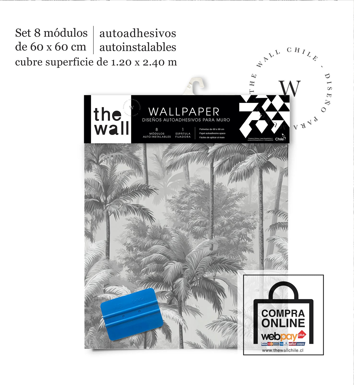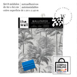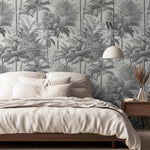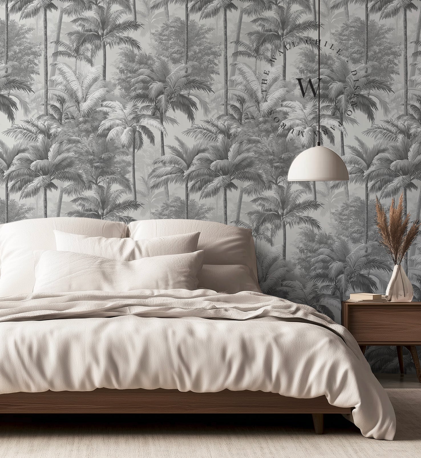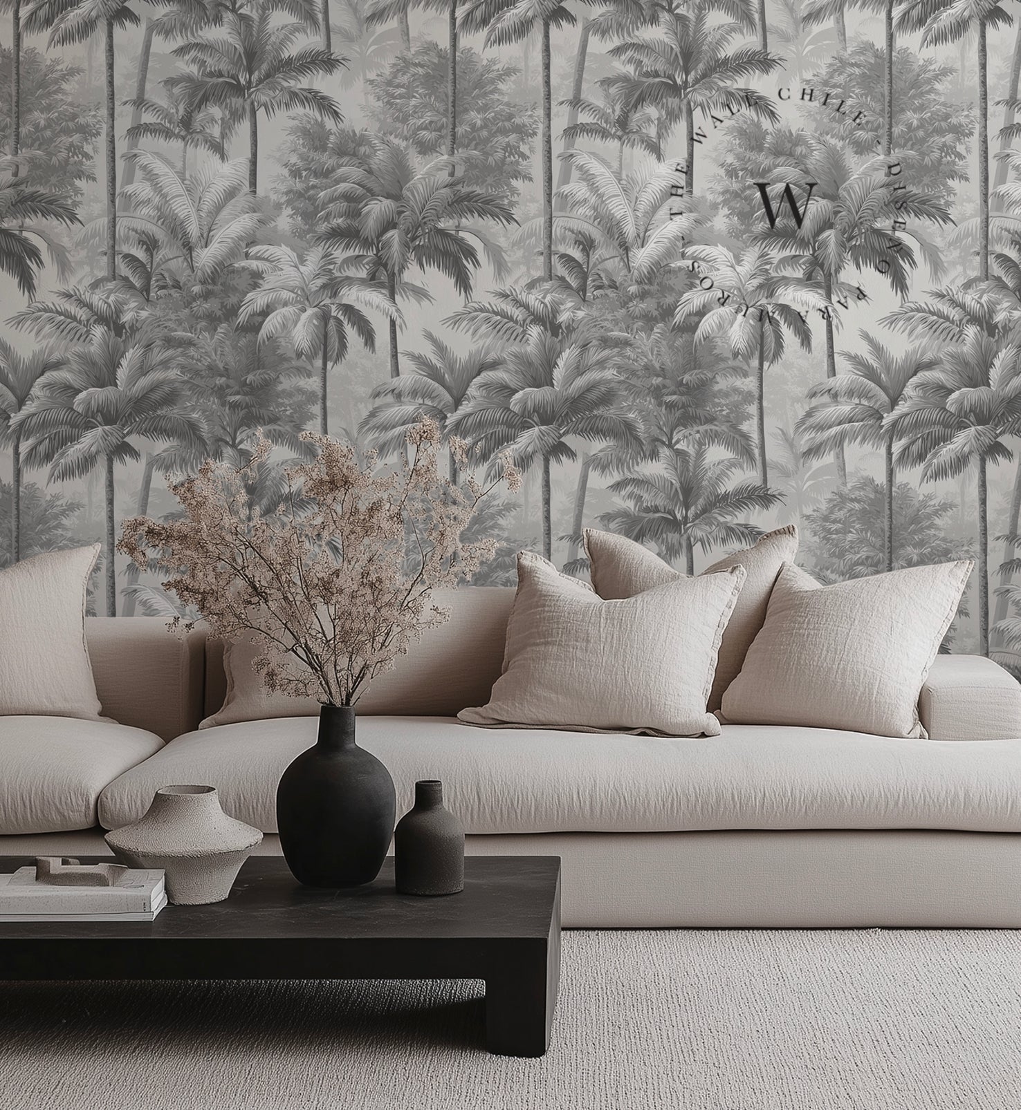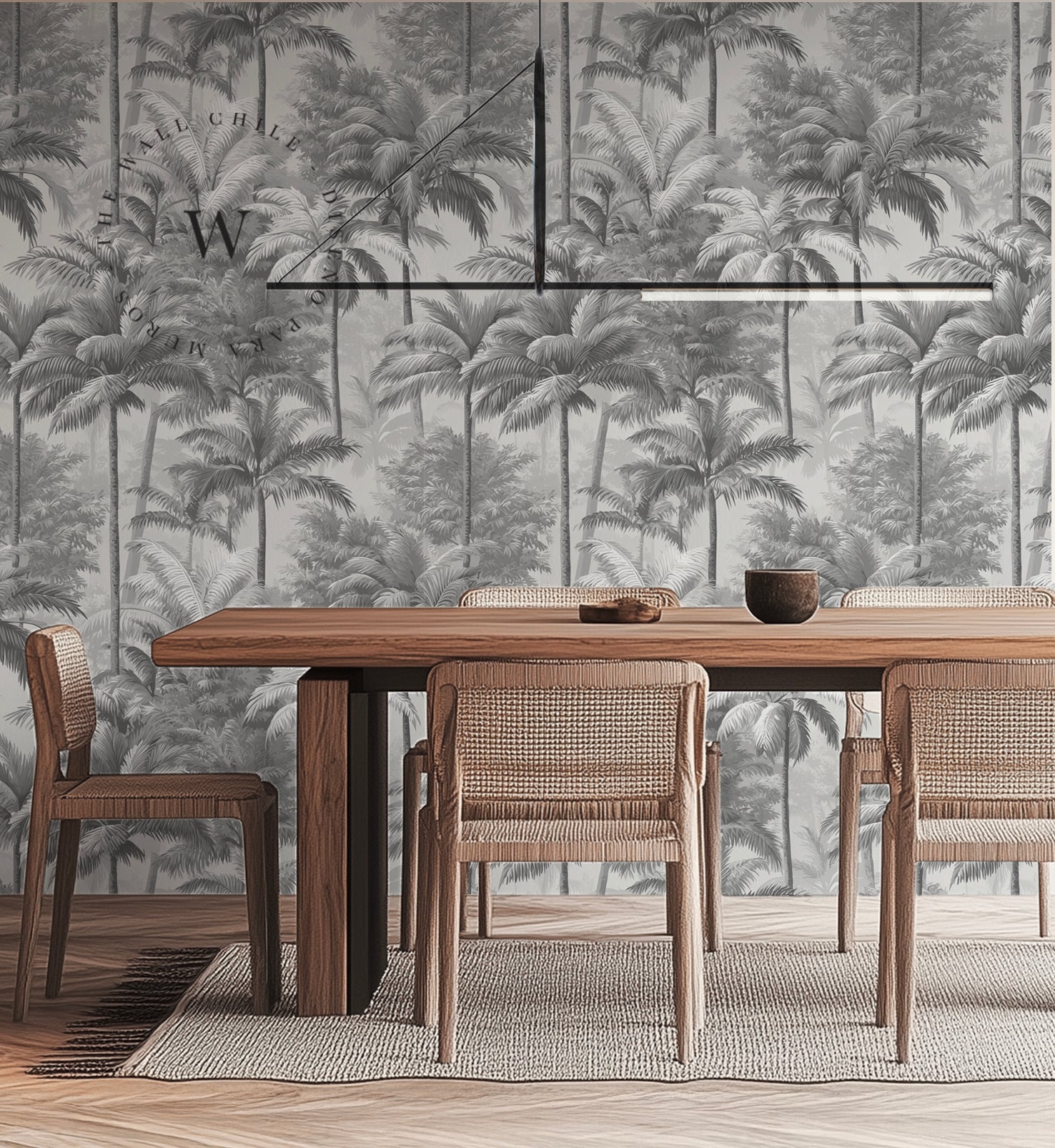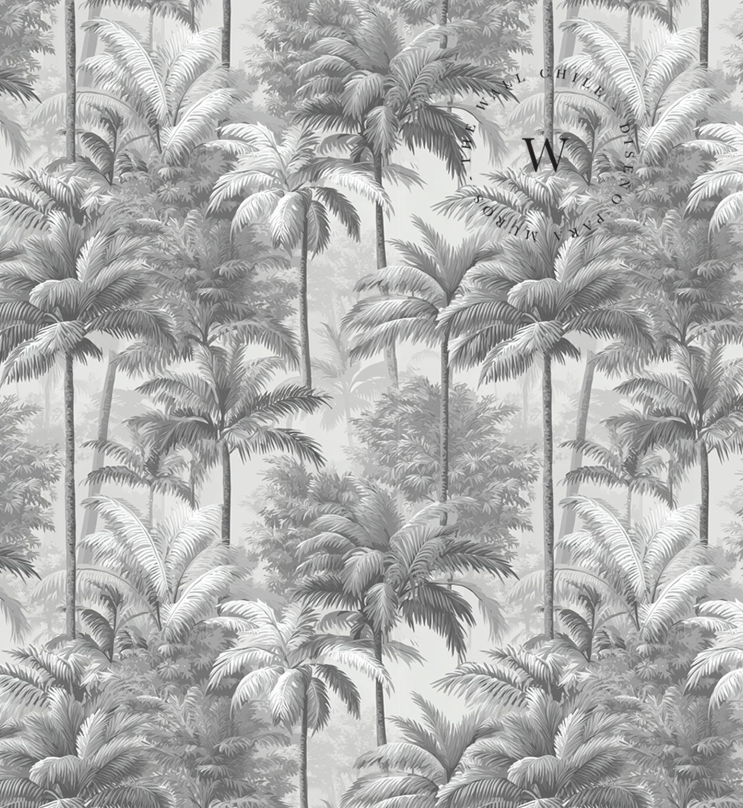 Un paisaje tropical reinterpretado en escala de grises. Grey Tropical combina palmeras y follaje en una composición elegante y envolvente que aporta profundidad sin perder sobriedad.