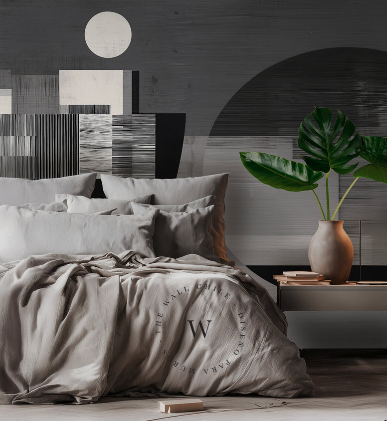 Con formas abstractas en tonos negro, gris y blanco, este diseño explora el equilibrio entre estructura, textura y movimiento, evocando el arte moderno y la pureza del minimalismo.